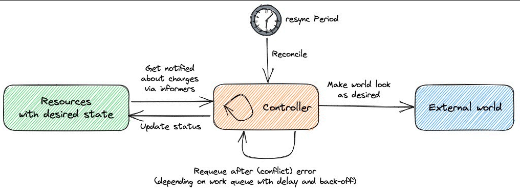 Kubernetes 控制器会监听资源的 创建/更新/删除 事件,并触发 Reconcile 调谐函数作为响应,整个调整过程被称 作 Reconcile Loop(调谐循环) 或者 Sync Loop(同步循环)。Reconcile 是一个使用资源对象的命名空间和资 源对象名称来调用的函数,使得资源对象的实际状态与 资源清单中定义的状态保持一致。调用完成后,Reconcile 会将资 源对象的状态更新为当前实际状态。我们可以用下面的一段伪代码来表示这个过程: