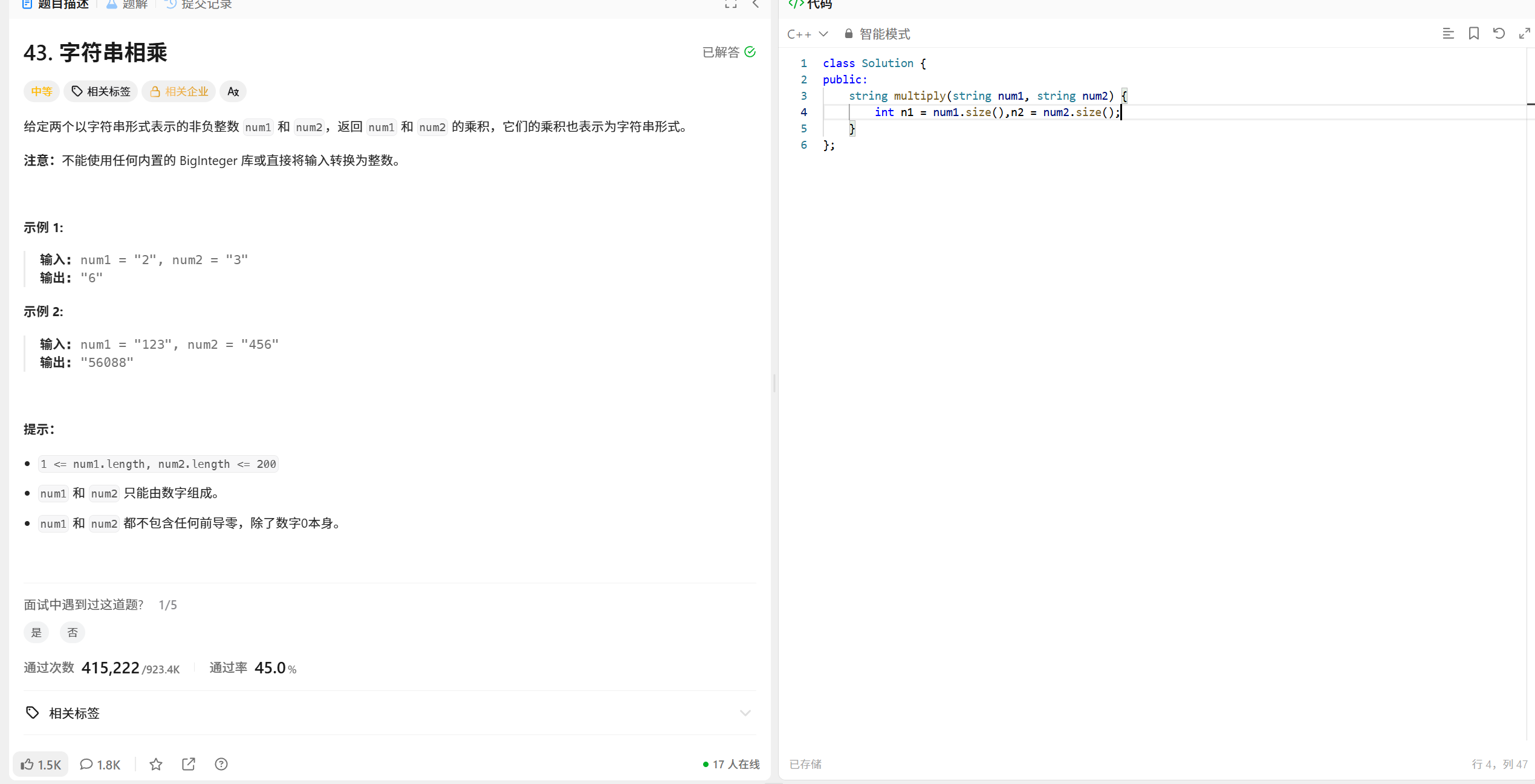 但这样会很麻烦,所以我们多开辟一个数组,然后先记录下当前每一位的乘积,然后再处理进位,最后构建答案。
