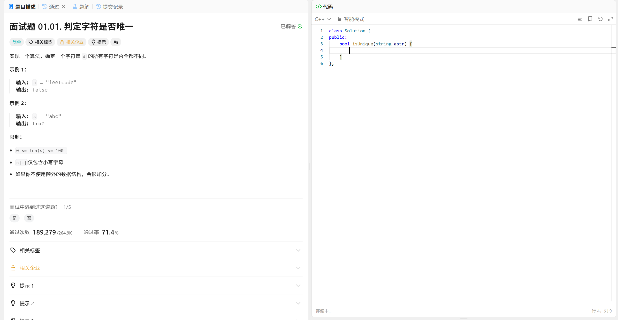 拿到这个题我首先想到的就是哈希表,第一个循环遍历字符串,将所有的字符都加进去,记录下出现的次数。第二次则是循环后找是否存在次数大于1的字符。有false没有true。