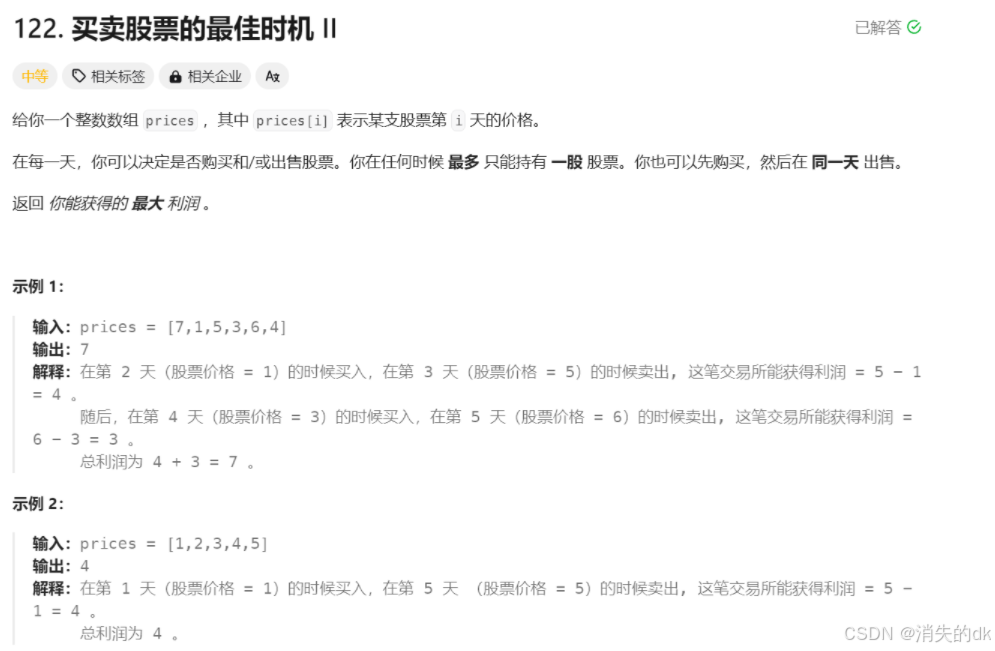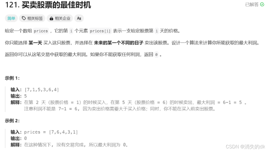 2、递推公式 dp【i】【0】 = max(dp【i-1】【0】,-prices【i】) 前面说过,持有股票有两种情况,如果是之前就有股票,那么就是dp【i-1】【0】,如果之前一直没买股票,然后买了第i天这个股票,那么我们的利润应该是-prices【i】,为什么不是dp【i-1】【1】-prices【i】?从两个方面都可以解释,一方面,本题只能买股票一次,如果我们选择第i天买这个股票,那么我们第i天之前应该是买不了股票,更加卖不了股票,也就是说什么操作都不做。那么我们的利润应该一直都是0,所以当我们第i天买这个股票时,我们的利润变成了-prices【i】。第二个方面,我们前面已经解释过了不持有股票的状态,有三种情况。而想用dp【i-1】【1】-prices【i】的同学是想用这三种情况中的第一种情况。