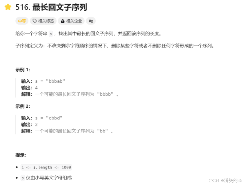 dp[i] [j]为 s[i] 到 s[j] 序列的最长回文子序列