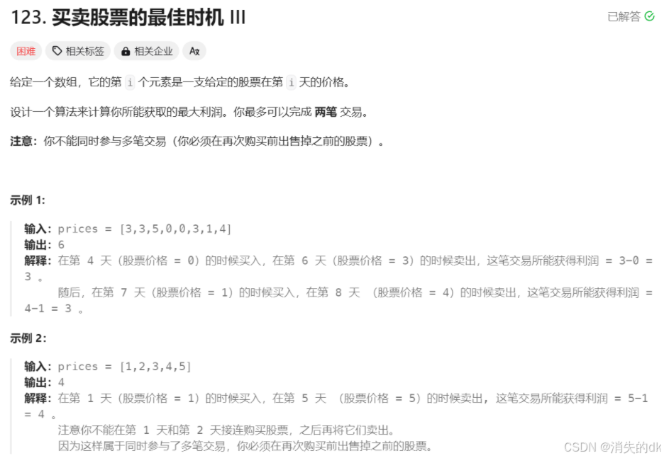 1、确定dp数组以及下标的含义 每天其实就是两种状态,手里有股票和手里没股票,再加上"某天"这个维度,所以用一个二维的就可以表示所有天数的情况。dp数组有i行,i就是天数。有两列,表示某一天的两种情况。 dp【i】【0】表示,第i天手里持有股票的状态(这里持有的这个股票有两种情况,一是前面一直没买过股票,买了第i天这个股票,也可能是第i天之前的某一天已经买了一个股票,一直没卖,然后一直持有到第i天),能有的最多利润 dp【i】【1】表示,第i天手里不持有股票状态(这里的不持有股票有三种情况,一是从第0天到第i天,一直没买过股票,二是第i天之前的某一天买过股票,我们在第i天卖掉,三是在第i天之前已经有过一次买股票和一次卖股票的操作了所以在第i天是不持有股票的状态),能有的最多的利润