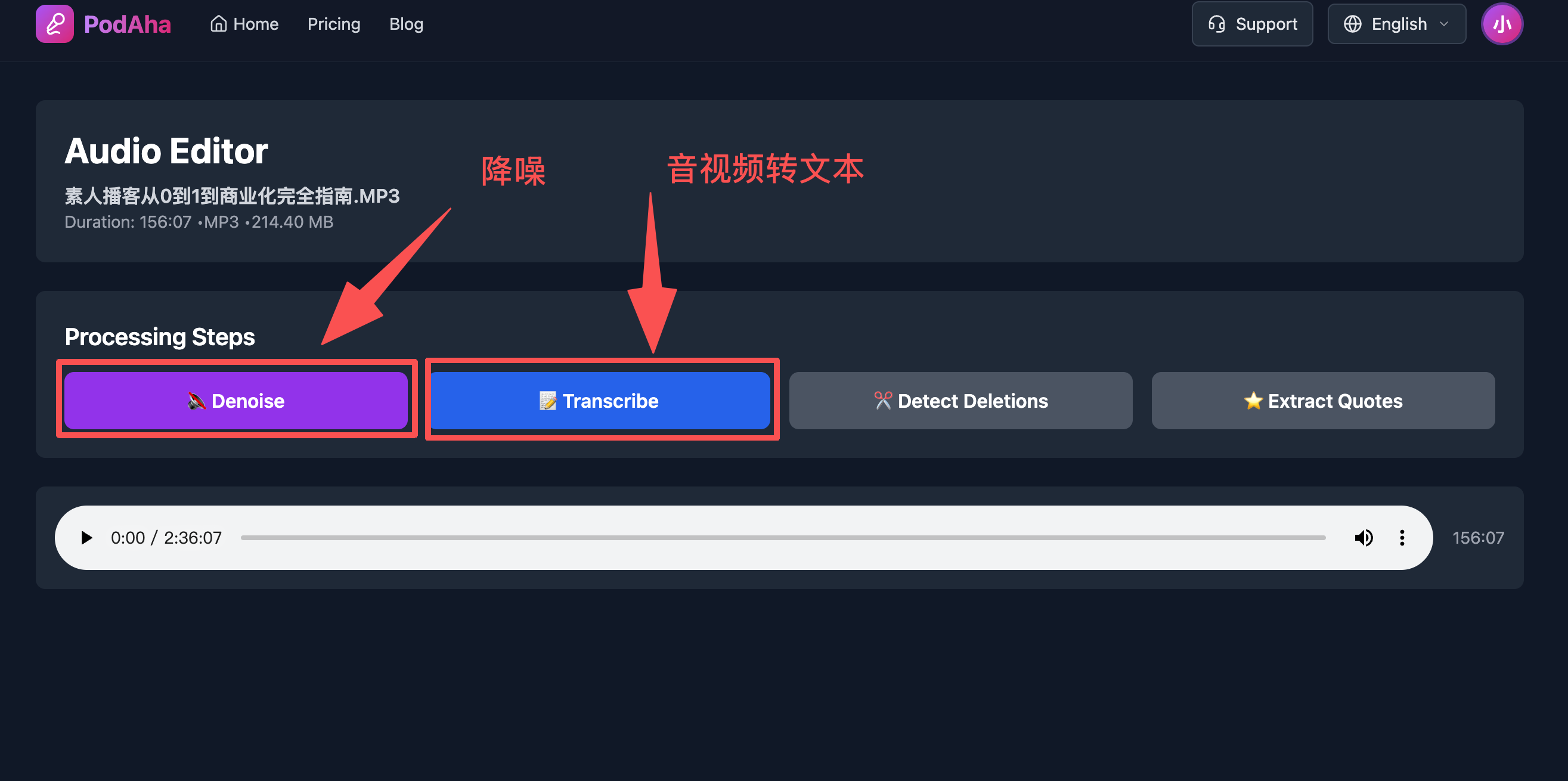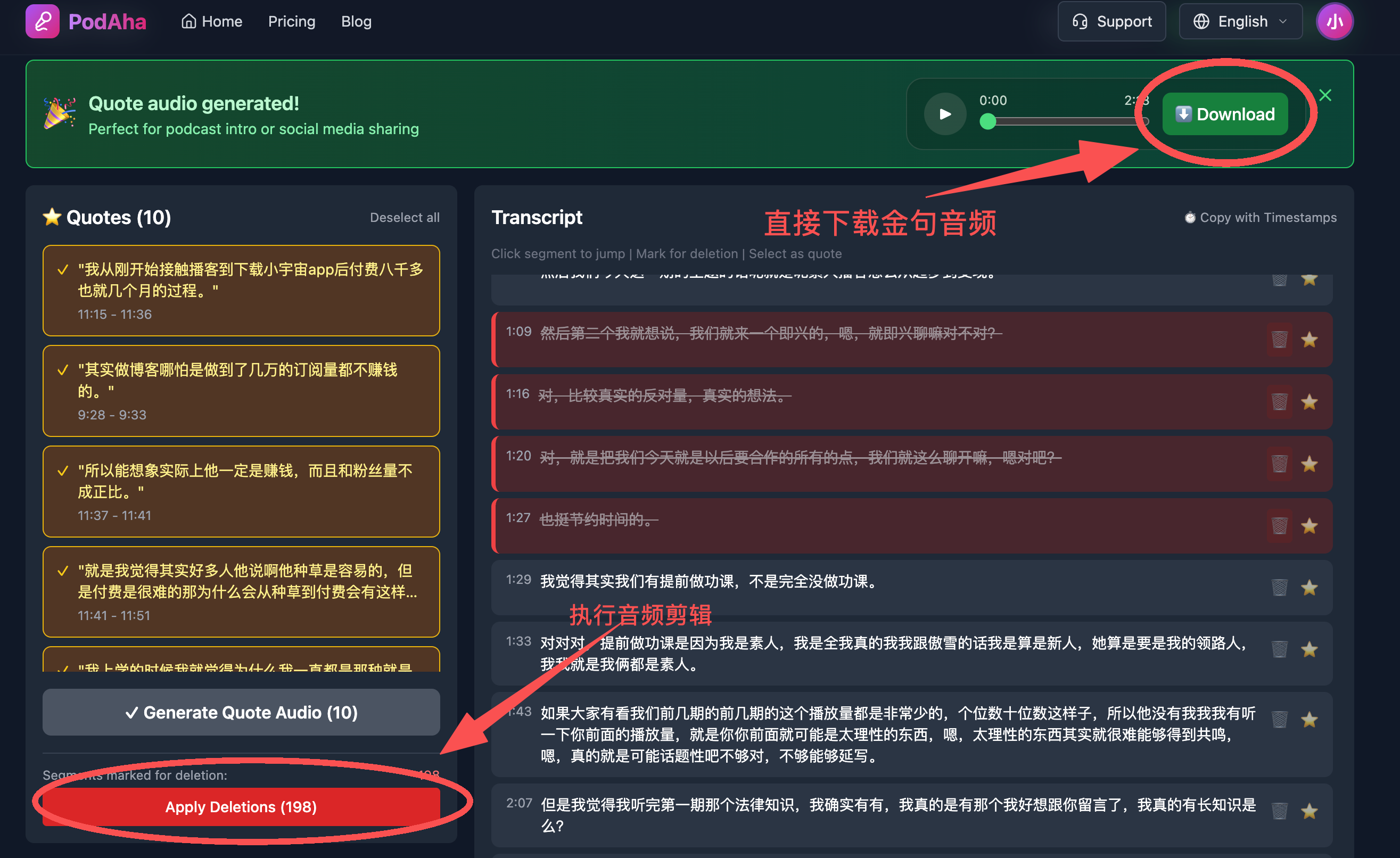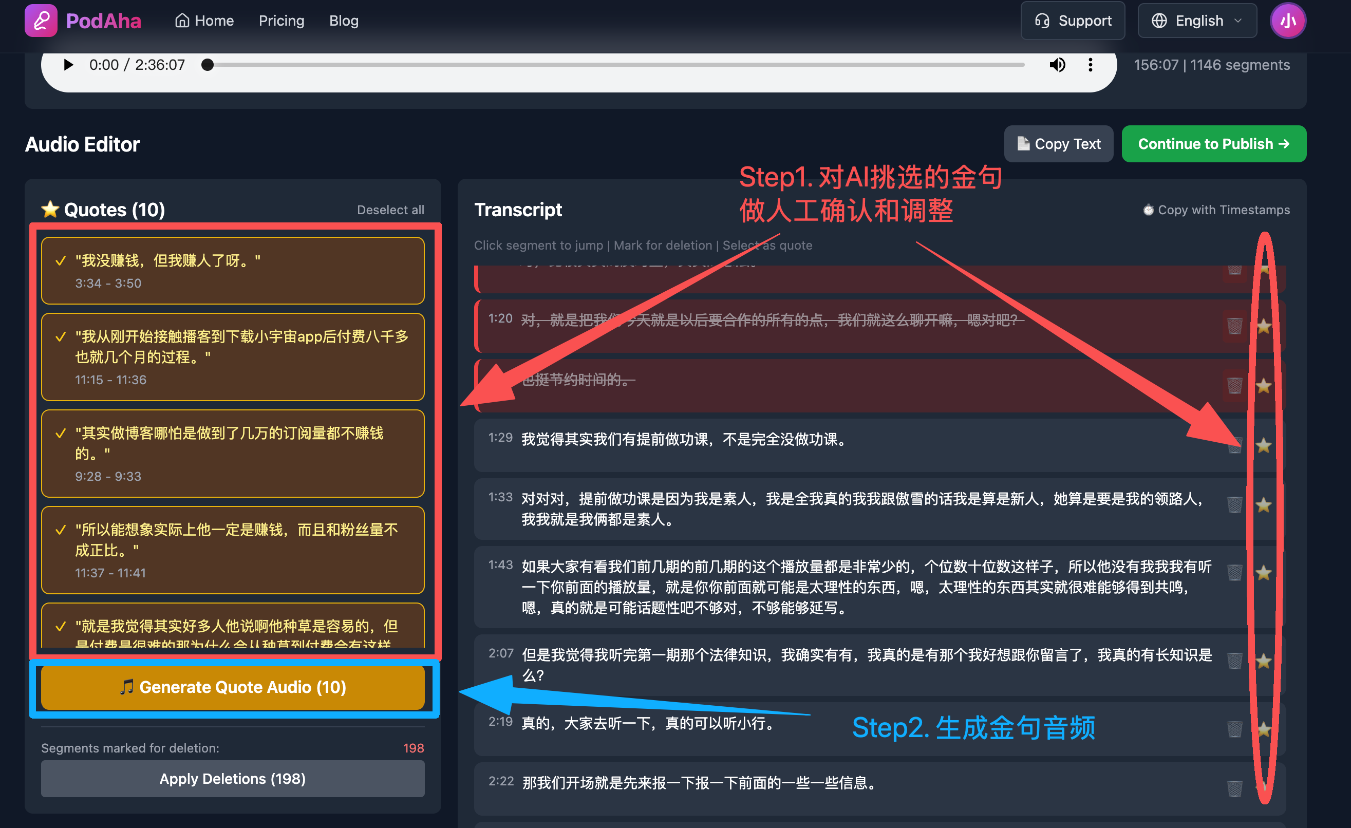 高效的剪辑不是机械地去除口头禅,而是对长达数小时的对话进行"内容提纯":快速定位核心论点、剔除冗余的追问与离题话术、并智能拼接高光金句。这正是AuraMind旗下产品PodAha所擅长的。它采用"文本驱动剪辑"