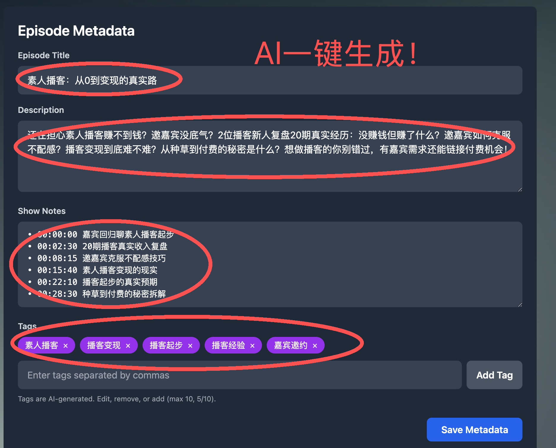 AI赋能文案创作:为每一期节目手动撰写精彩的描述和详细Shownotes是另一项耗时任务。PodAha等工具能基于剪辑后的内容,自动生成节目描述(Description)和Shownotes草案,创作者只需稍作调整即可,极大提升了发布效率。