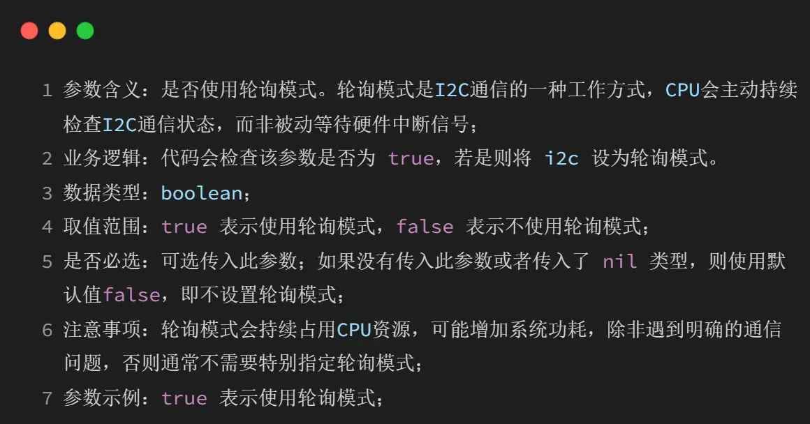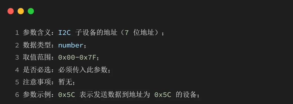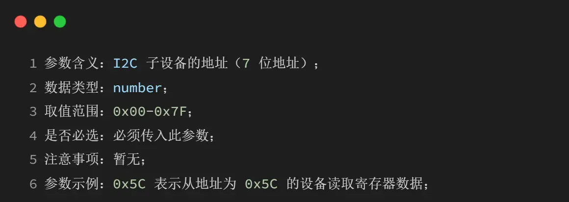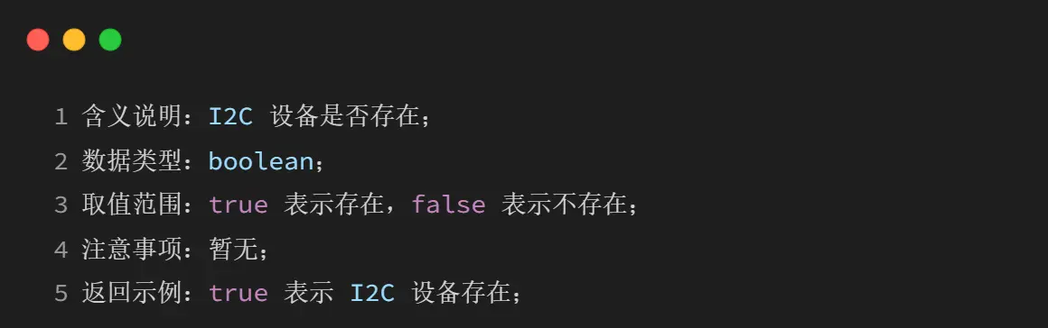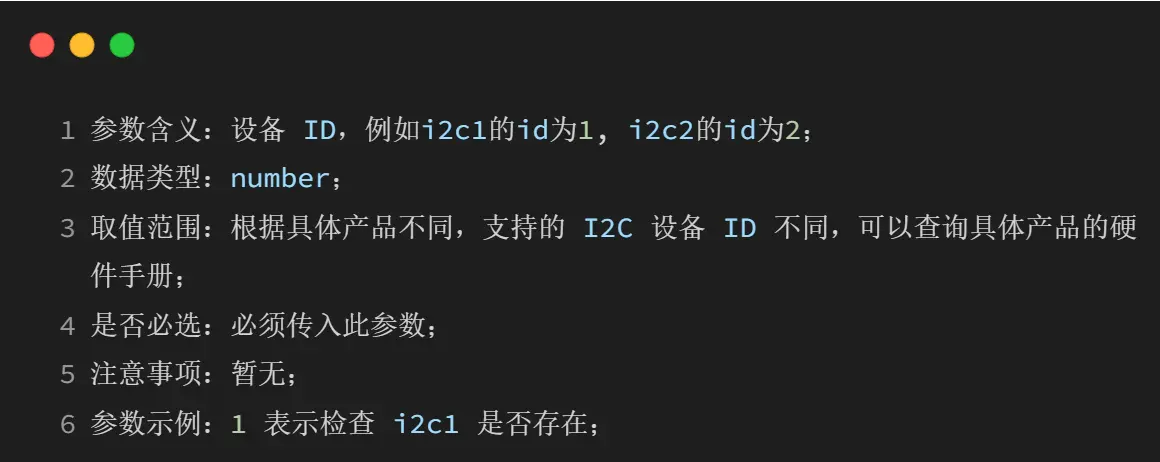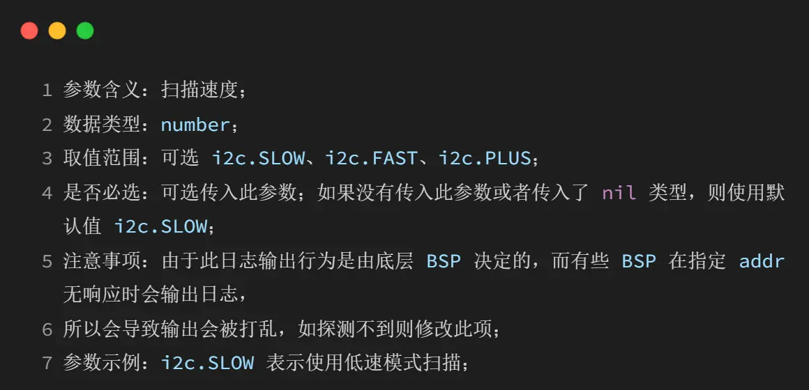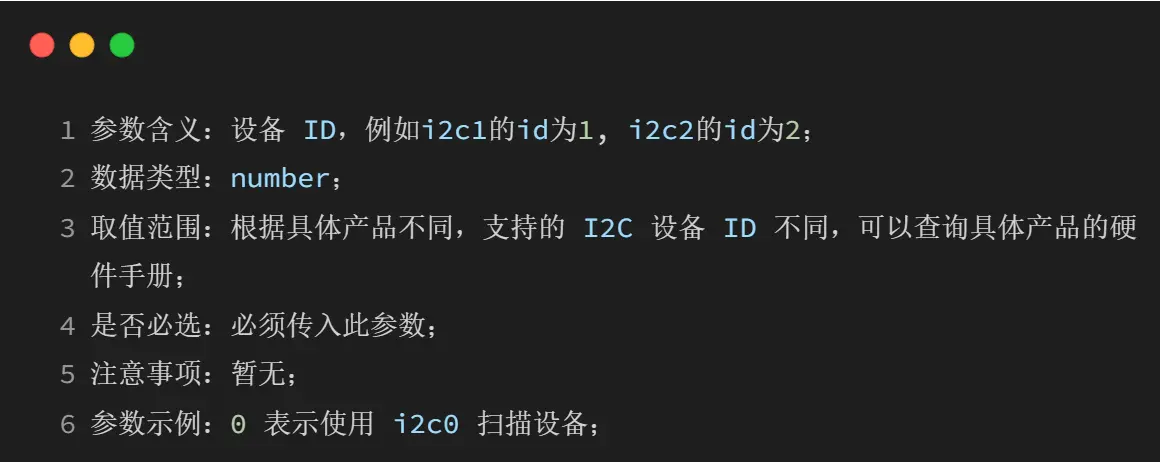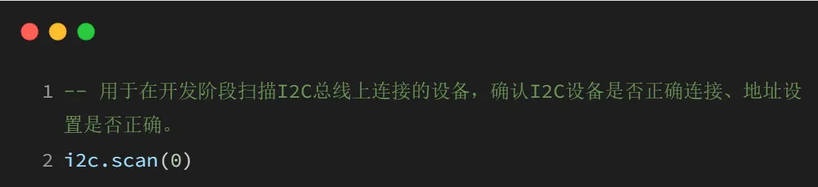 本函数用于在开发阶段扫描 I2C 总线上连接的设备,确认 I2C 设备是否正确连接、地址设置是否正确。