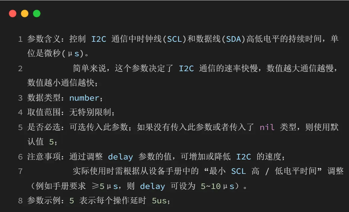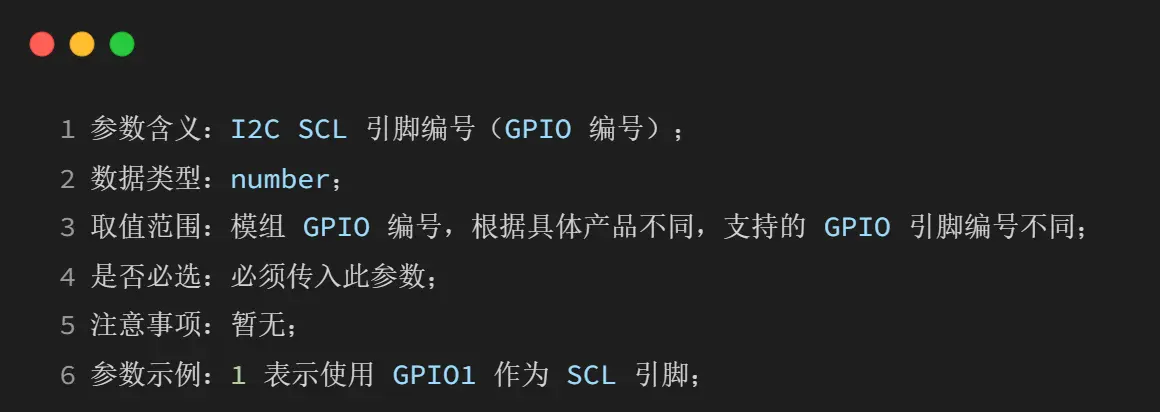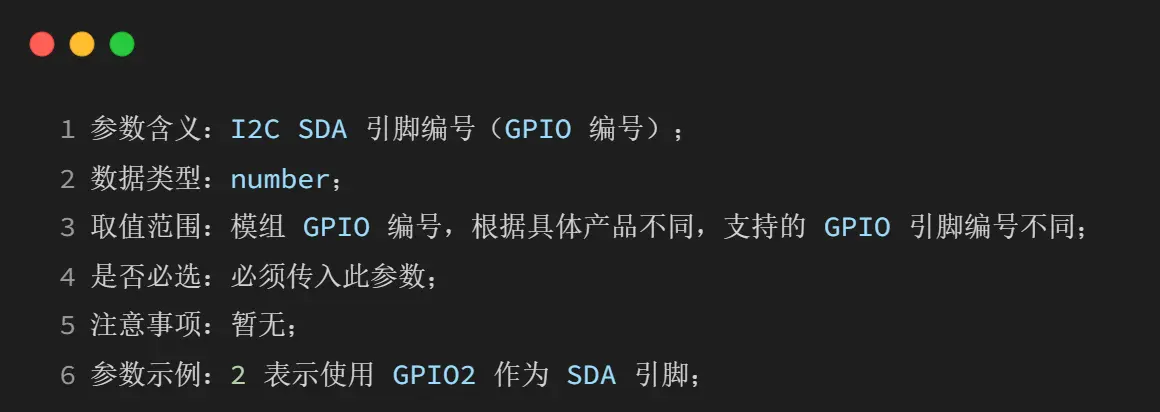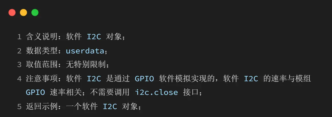 创建一个软件 I2C 对象,软件 I2C 的速率与模组 GPIO 速率相关(约100K),需注意 GPIO 驱动能力,AGPIO 驱动能力较弱,尽量选用普通 GPIO,适用于硬件 I2C 不够用的场景。