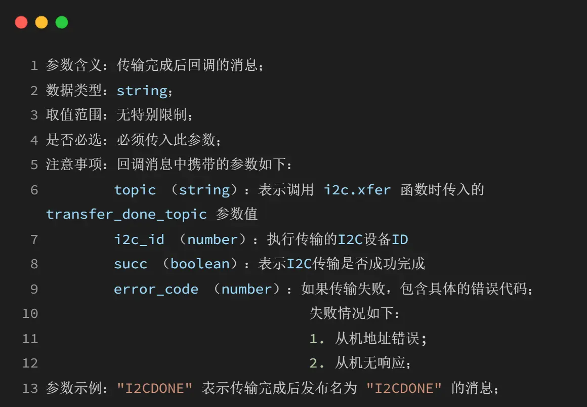 I2C 非阻塞通用传输,类似 transfer,但是不会等到 I2C 传输完成才返回,调用本函数会立刻返回,I2C 传输完成后,通过消息回调。