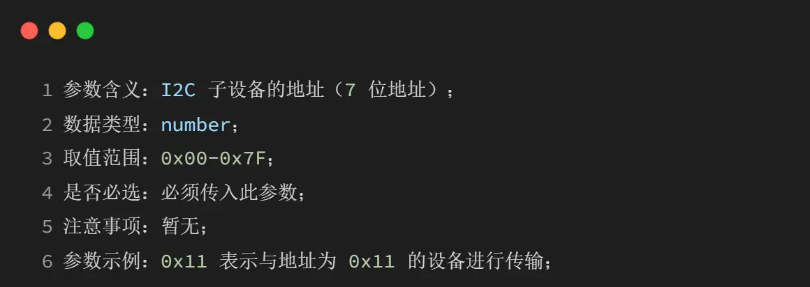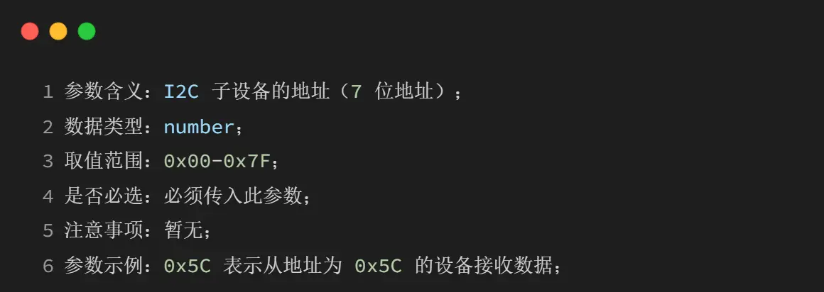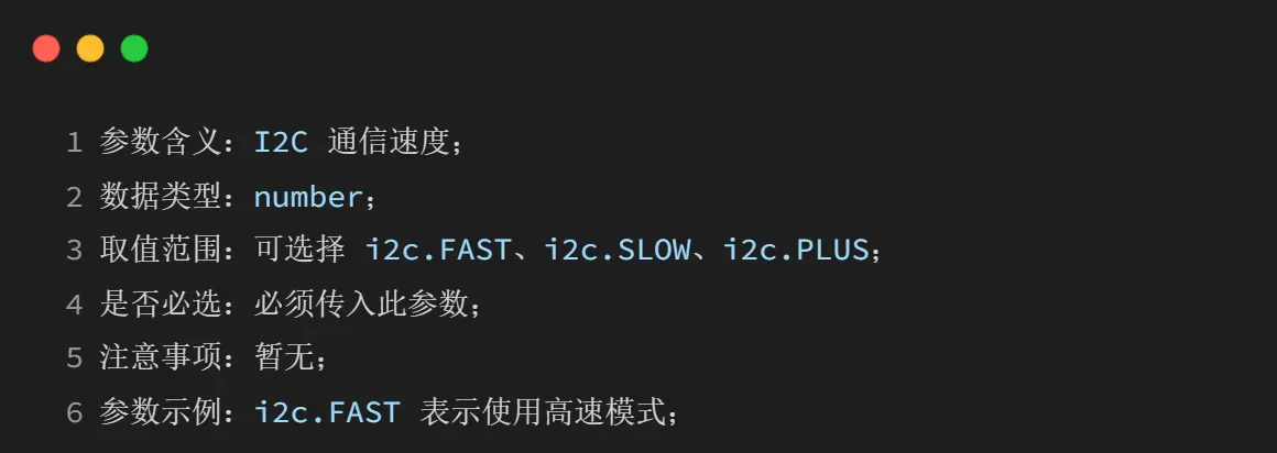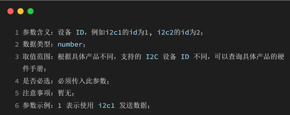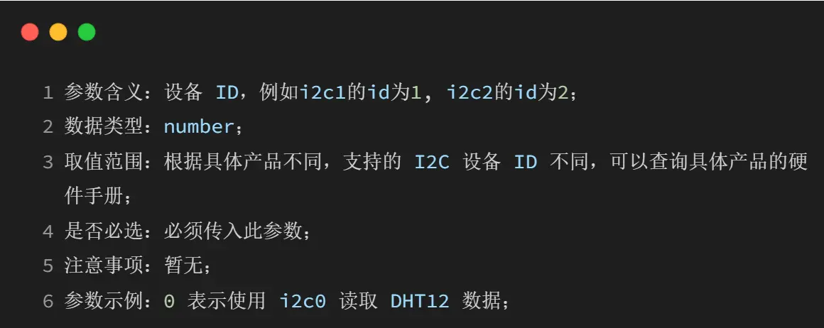 关闭指定的 I2C 设备,关闭后如需重新使用 i2c 功能,无需使用 i2c.setup() 重新初始化,i2c 读写操作的时候会自动重新打开 i2c。