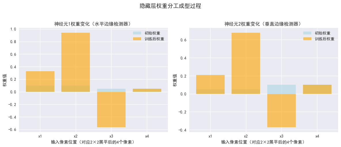 后两位权重(x3、x4,对应样本2"垂直边缘"的亮像素):x3权重降至-0.371(抑制作用),x4保持0.1不变------这并非与预期矛盾,而是模型"自发优化分工"的体现:由于样本量较少(仅2个样本),模型无需完全让两个神经元分别对应两种边缘,而是通过"神经元1主导水平边缘检测,神经元2辅助补充"的方式,实现整体损失最小化,这也符合前文"权重分工是损失驱动的被动优化,而非主动分配任务"的核心逻辑。