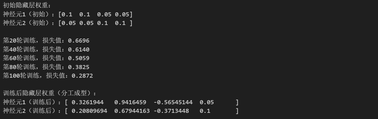 运行输出中,训练后隐藏层权重(分工成型)如下: