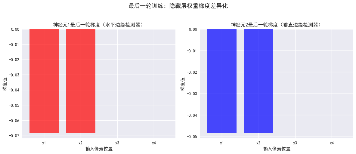 两个神经元的权重不再是"微弱差异",而是形成了"主导-辅助"的差异化分工,避免了"两个神经元都关注同一特征"的冗余,完美印证了前文"反向传播引导权重向不同的、能降低损失的方向调整"的结论。