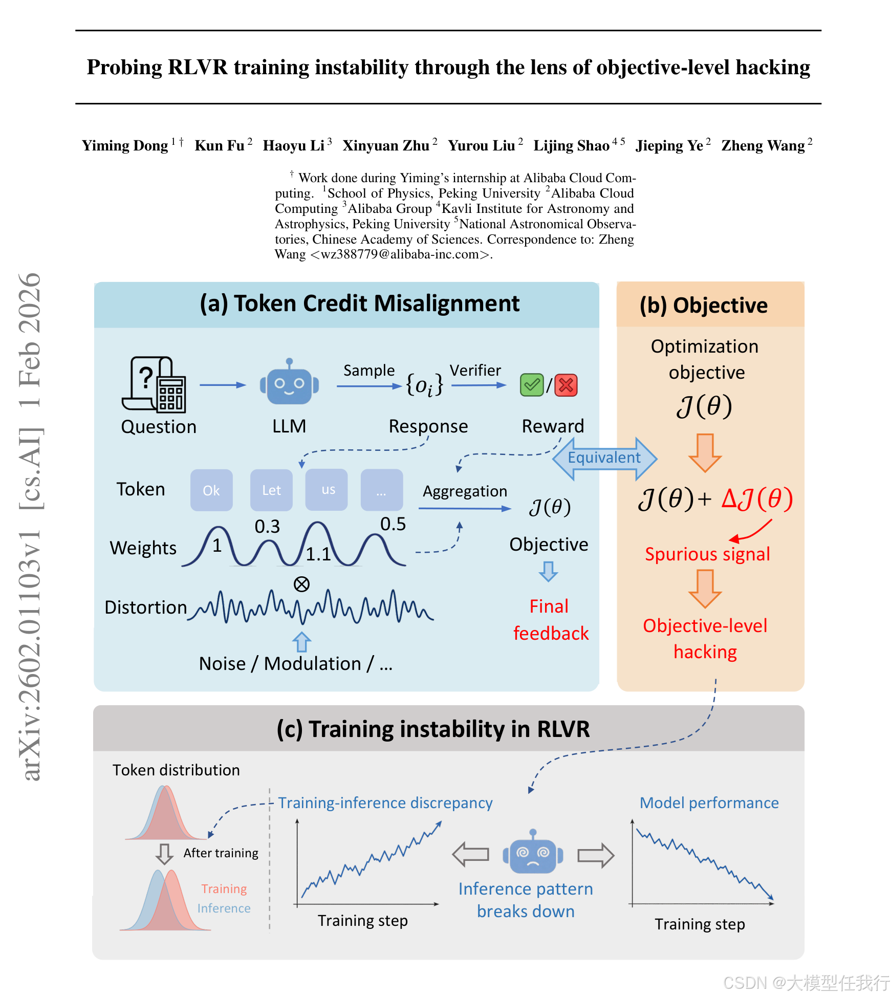 论文跳出传统奖励黑客视角,将训练不稳定性归因于优化目标中由token级信用错配诱发的隐式、累积性虚假信号。