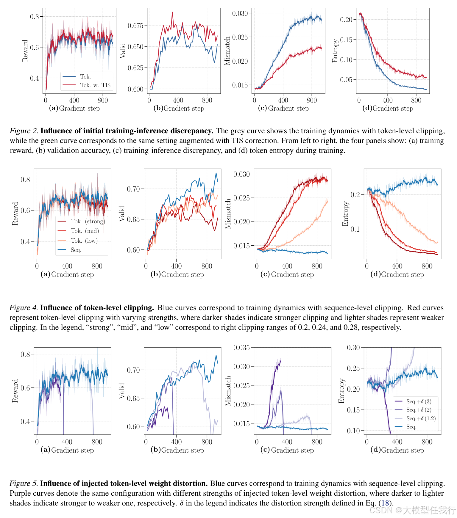🔸设计三组受控实验:TIS校正目标偏差、调节token裁剪强度、显式注入高低概率token权重扭曲,验证不同形式ΔdistJ(θ)与差异增长的统计相关性。