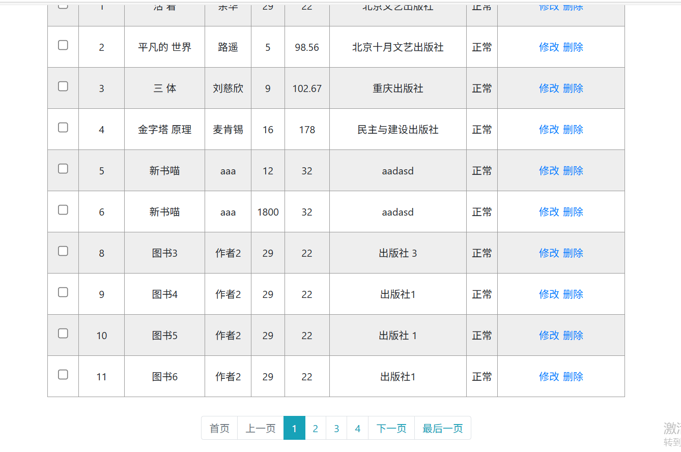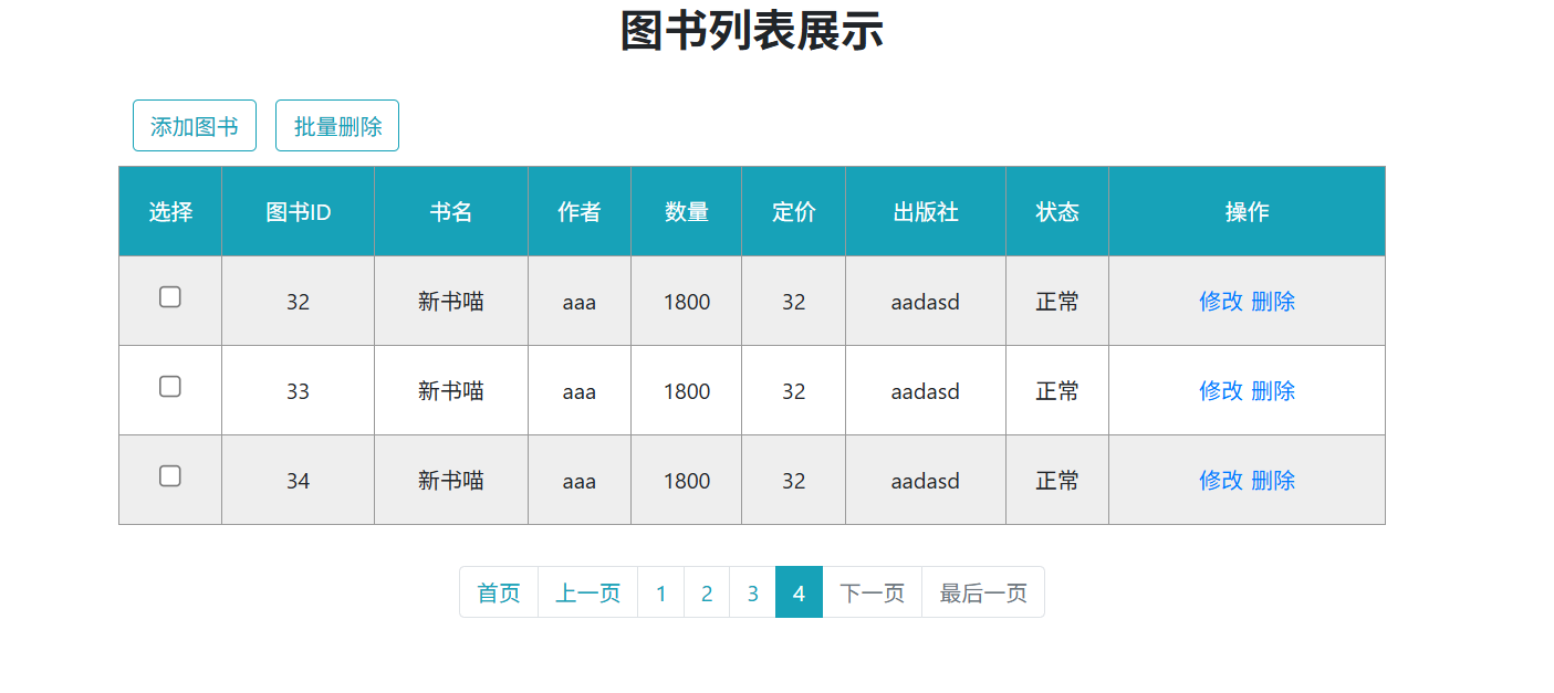 成功登录系统后,默认进入图书列表页面,系统采用分页模式展示所有图书数据,默认加载第一页内容,分页布局清晰,可正常切换页码。