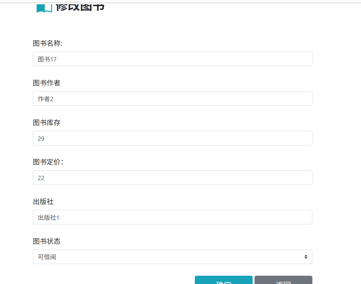 在图书列表页面,找到需要修改的图书,点击对应图书的"修改"按钮,系统会弹出修改图书弹窗,弹窗内会自动回显该图书的原有数据(图书名称、作者、库存等),无需重新输入所有信息。