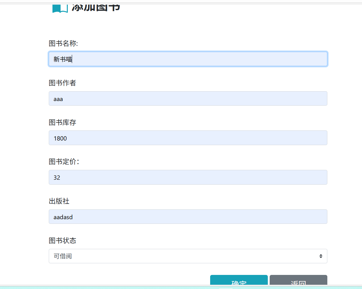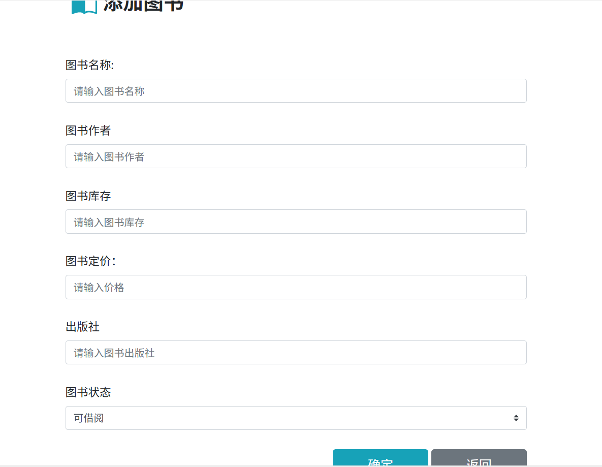 点击图书列表页面的"添加图书"按钮,会弹出添加图书弹窗,弹窗内包含图书名称、作者、库存、定价等必填字段,填写完整信息后点击"确定",即可完成图书添加。
