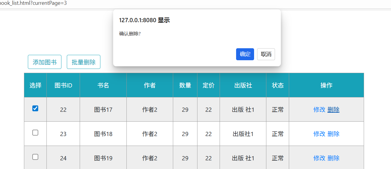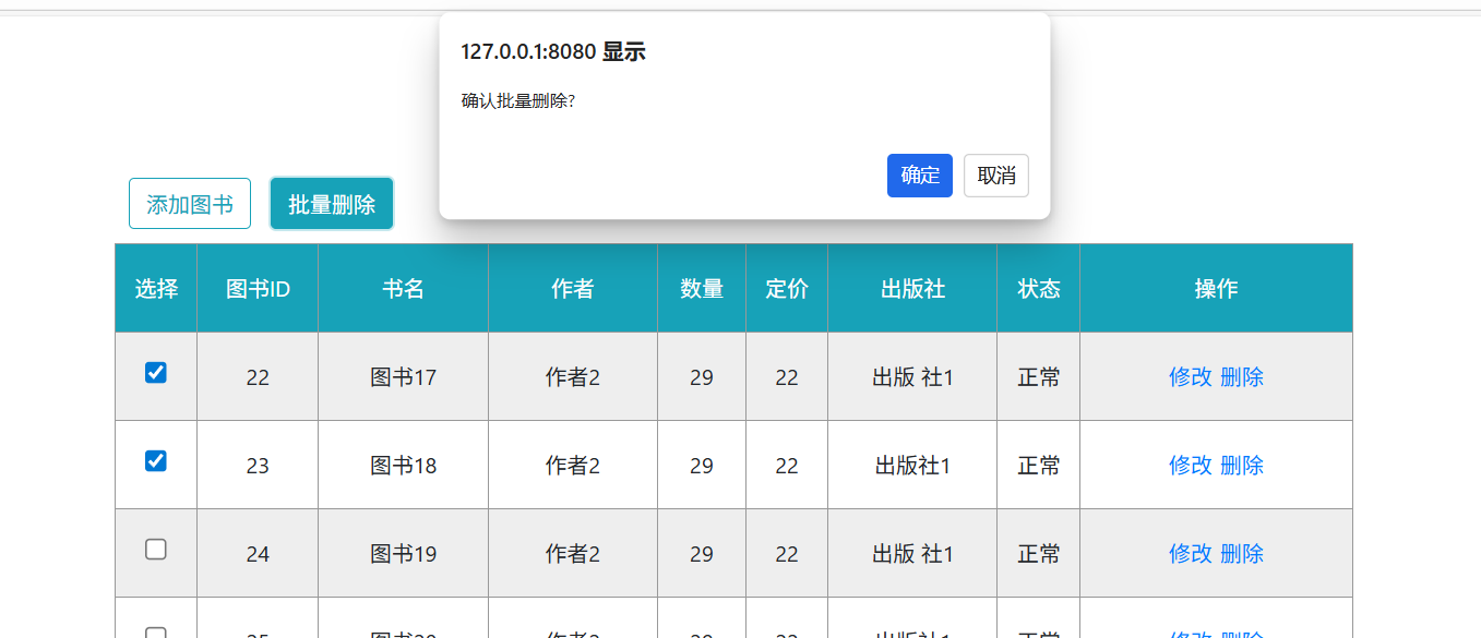 系统支持单个图书删除和多个图书批量删除两种方式,两种方式均有二次确认机制,防止误操作删除数据。