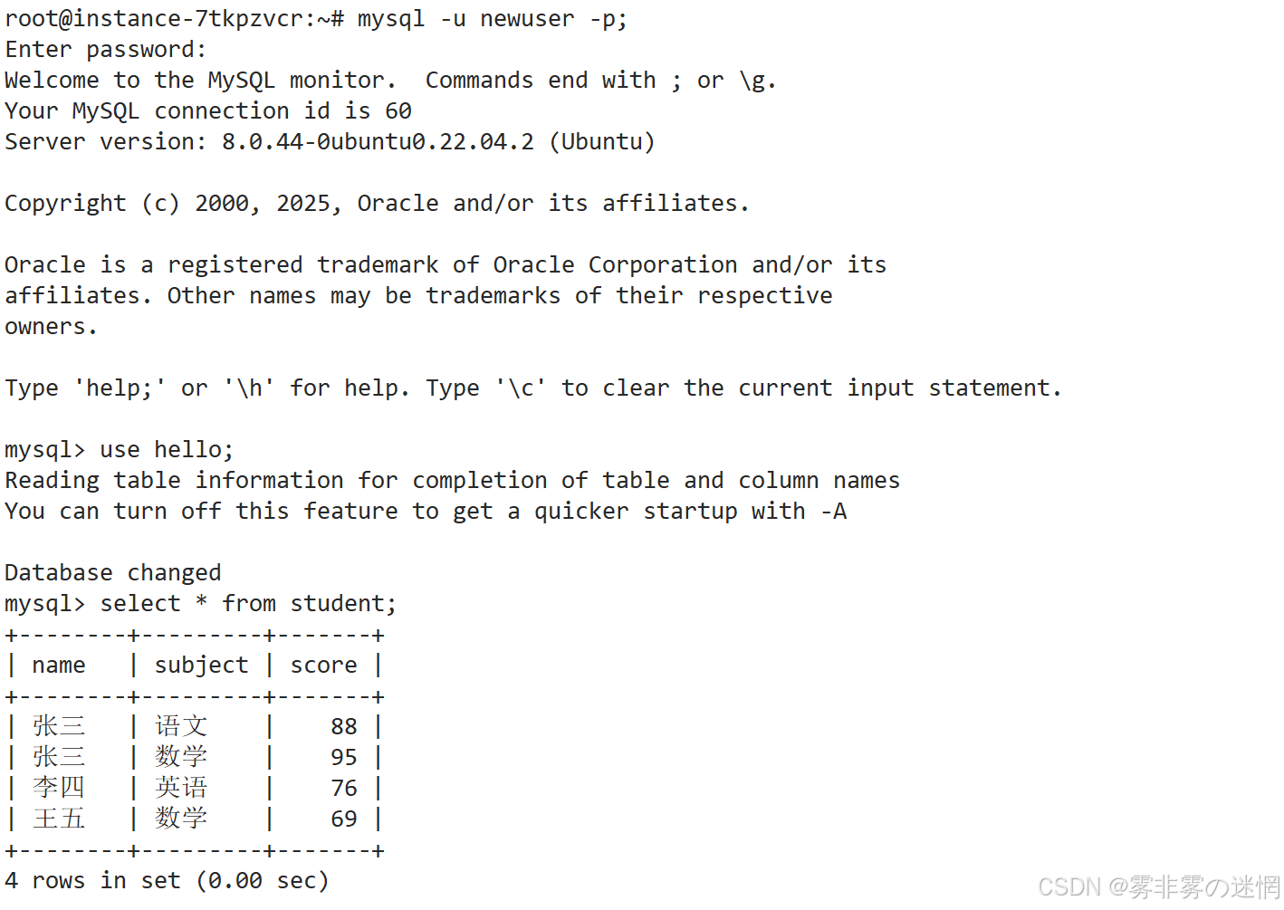 然后使用 newuser 普通用户登入访问授权的数据库和表: