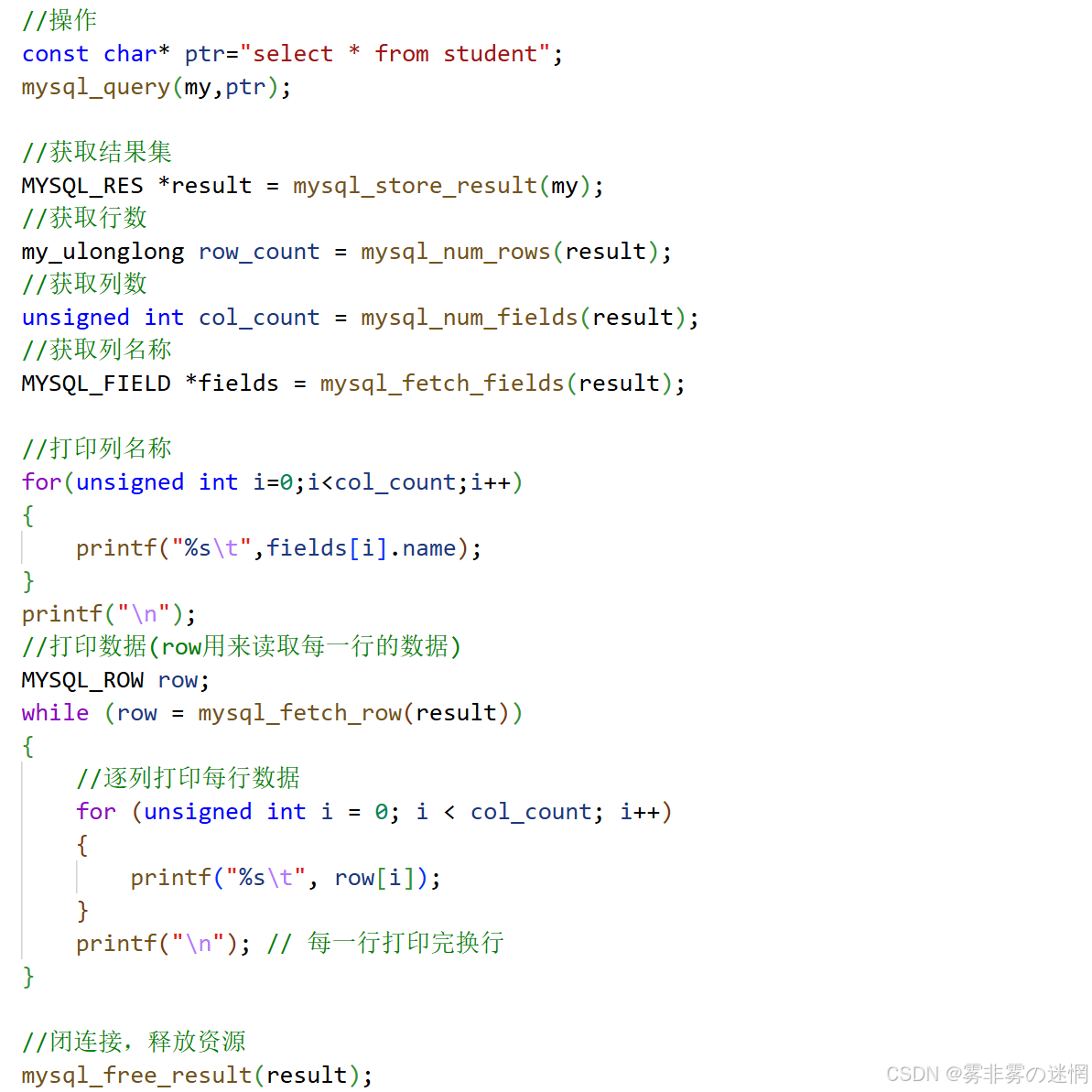 MYSQL_FIELD结构体数组,数组长度等于mysql_num_fields(res)的返回值。每个MYSQL_FIELD结构体的核心成员包括:name:列名(字符串);type:列的数据类型(如MYSQL_TYPE_INT对应 INT 类型);length:列的定义长度。