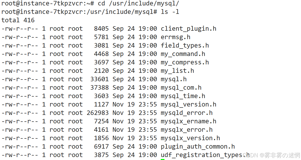库文件被放在 /usr/include/mysql 目录下:可以看到有 mysql.h