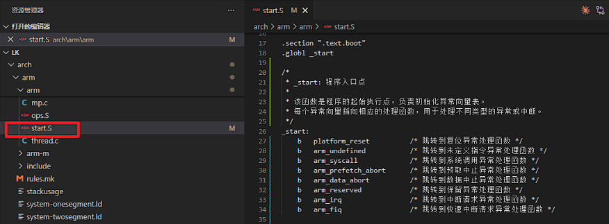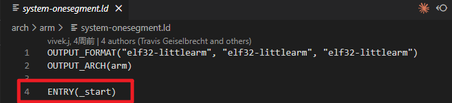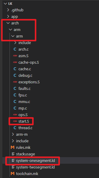 LK 的启动入口由链接脚本指定,链接脚本(如 arch/arm/system-onesegment.ld)