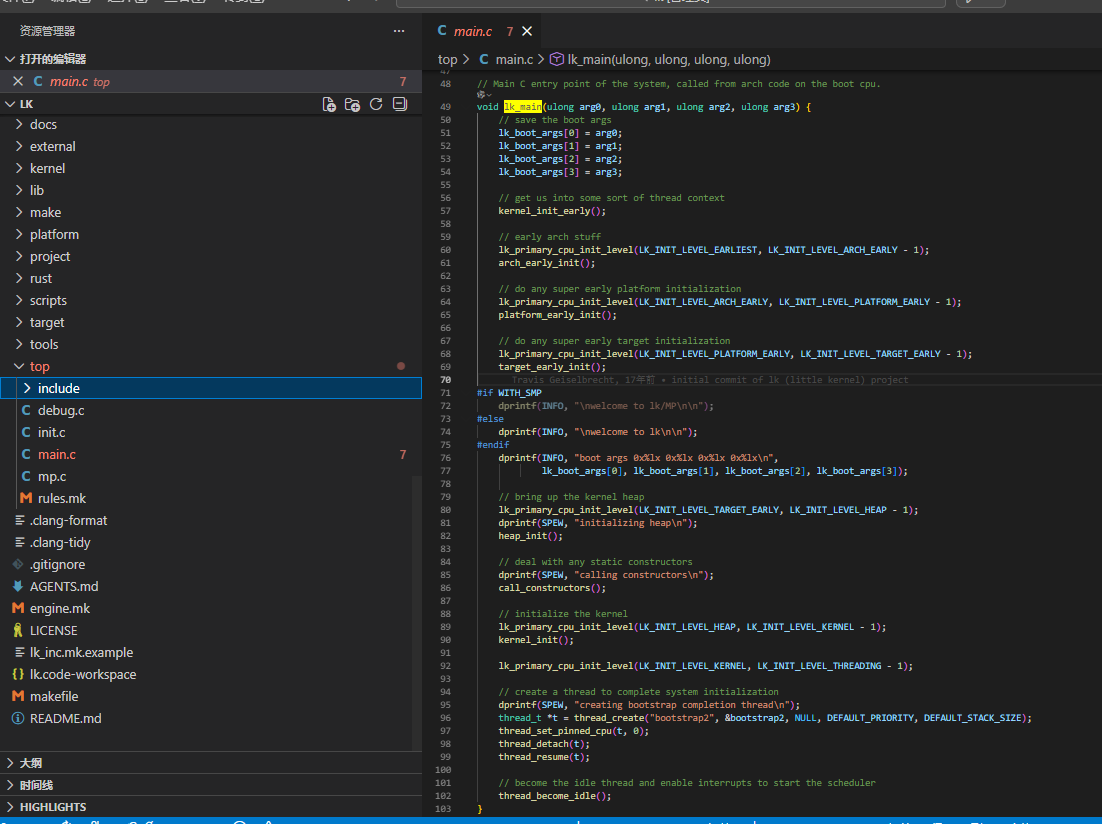 这段代码是LK(Little Kernel)操作系统的主入口函数[lk_main],功能如下: