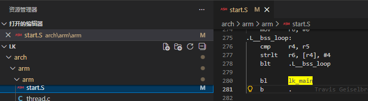 在该初始化函数中,最终通过汇编语言bl 跳转到主函数入口lk_main