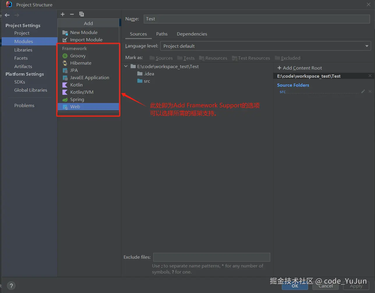 - 在Add弹出框的下方Framework,选中相应的框架支持。