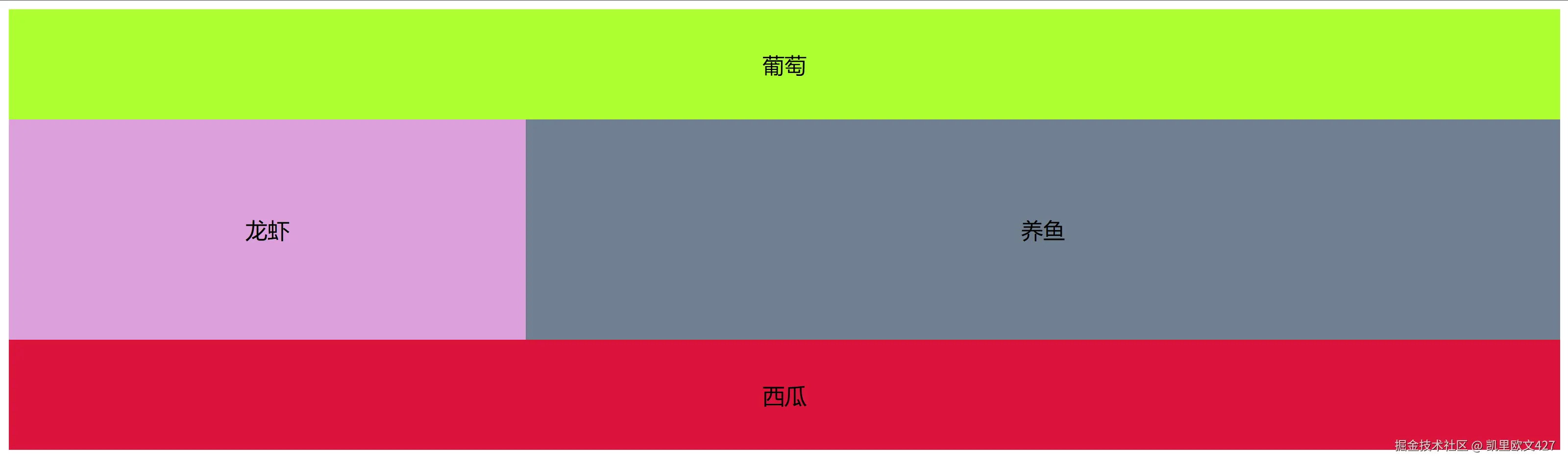 grid: "葡萄 葡萄 葡萄" 1fr "龙虾 养鱼 养鱼" 1fr "龙虾 养鱼 养鱼" 1fr "西瓜 西瓜 西瓜" 1fr / 1fr 1fr 1fr;