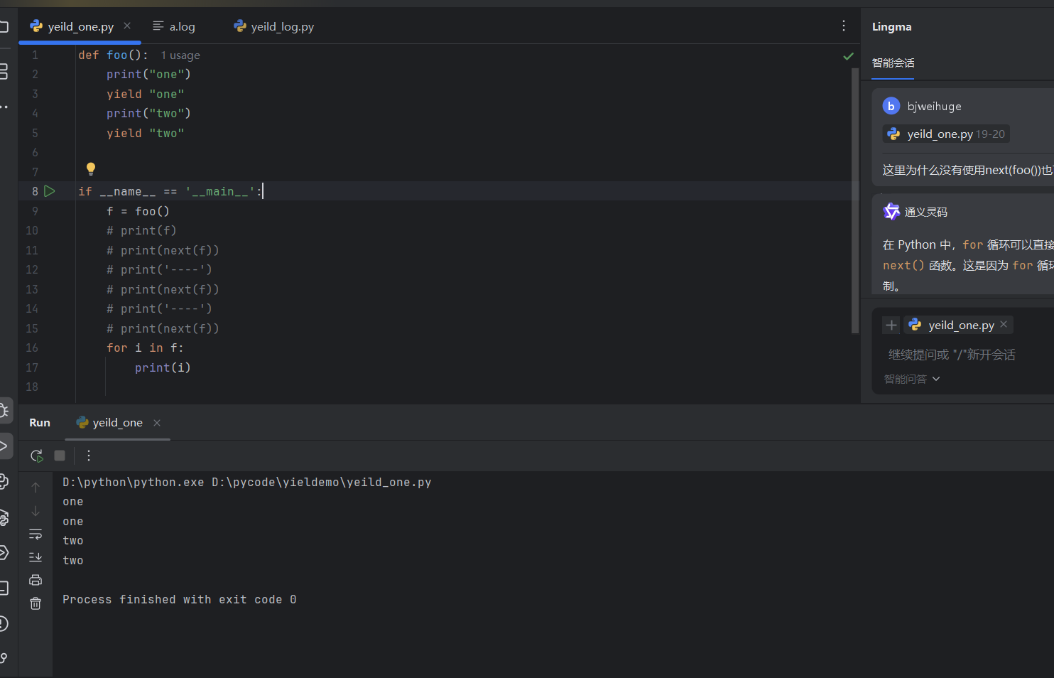 支持迭代协议: 包含 yield 的函数会自动变成生成器函数,返回一个生成器对象,该对象实现了迭代器协议(iter() 和 next() 方法)。
