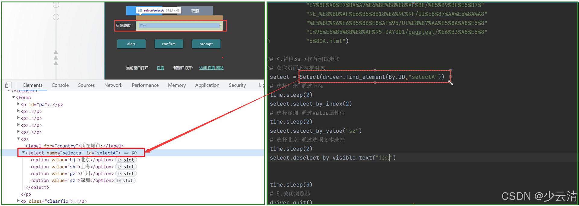 - ②针对于原生态标签的下拉框提供了Select对象实现选项选择固定方法