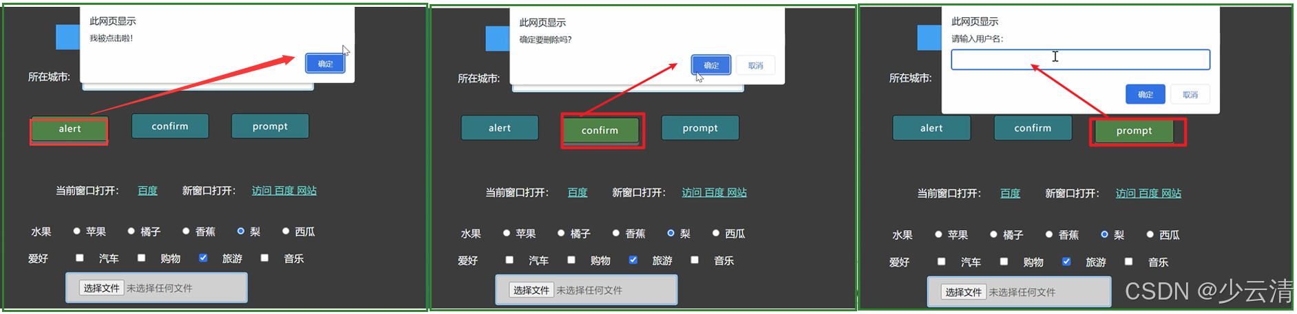- 常见S弹出框形式:alert(警告框)、confirm(确认框)、prompt(提示框)