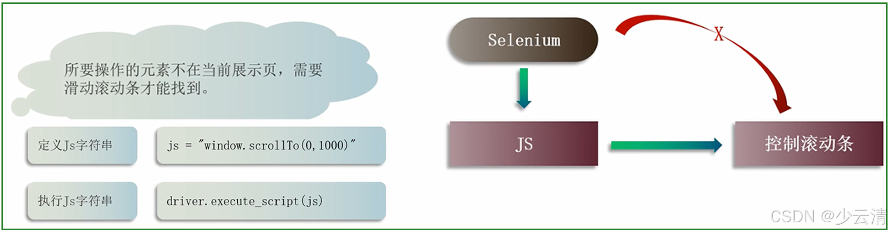 说明: selenium中并没有直接提供操作滚动条的方法, 但是它提供了可执行JavaScript脚本的方法, 所以我们可以通过JavaScript脚本来达到操作滚动条的目的。