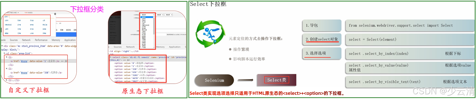 - ①无论是自定义还是HTML原生态的下拉框都可以直接通过元素定位的方式直接完成选项选择。