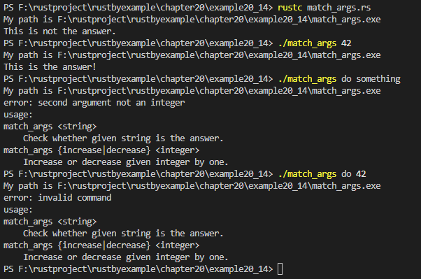 PS F:\rustproject\rustbyexample\chapter20\example20_14> ./match_args do 42