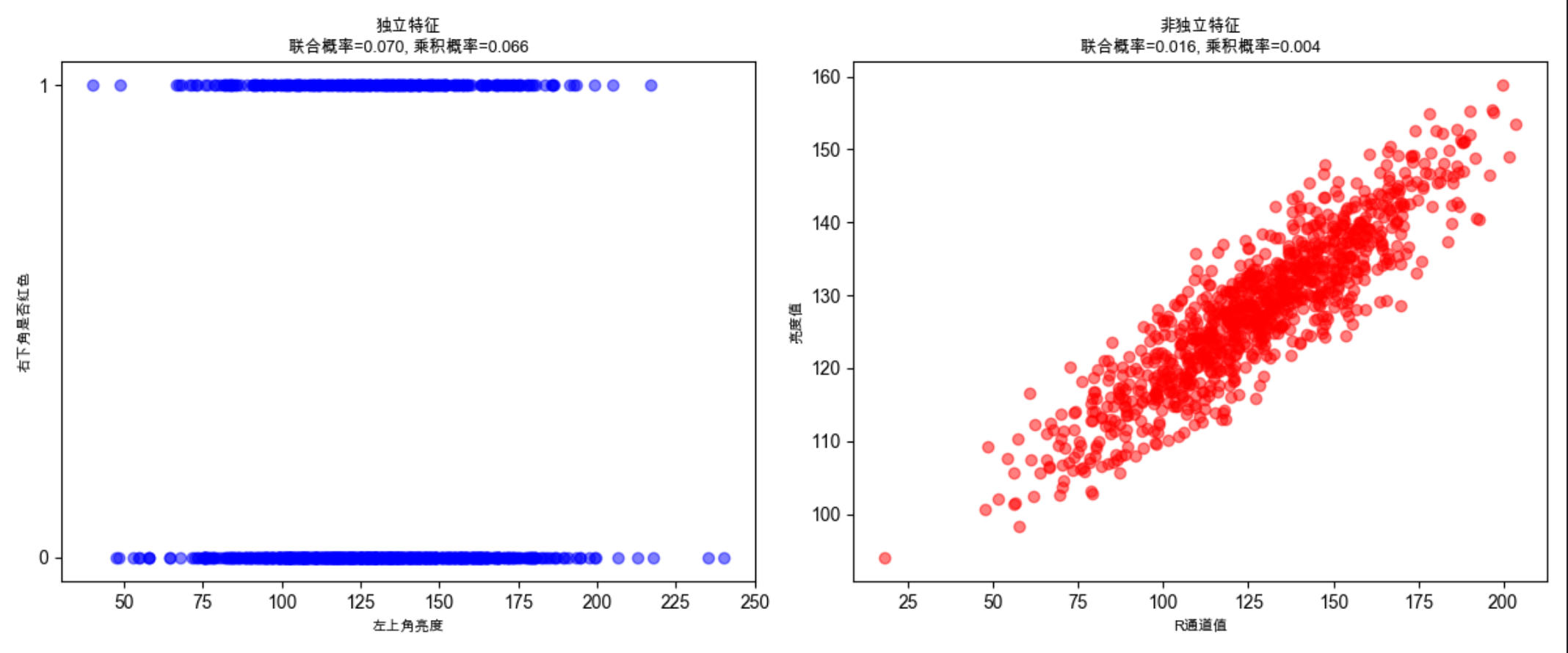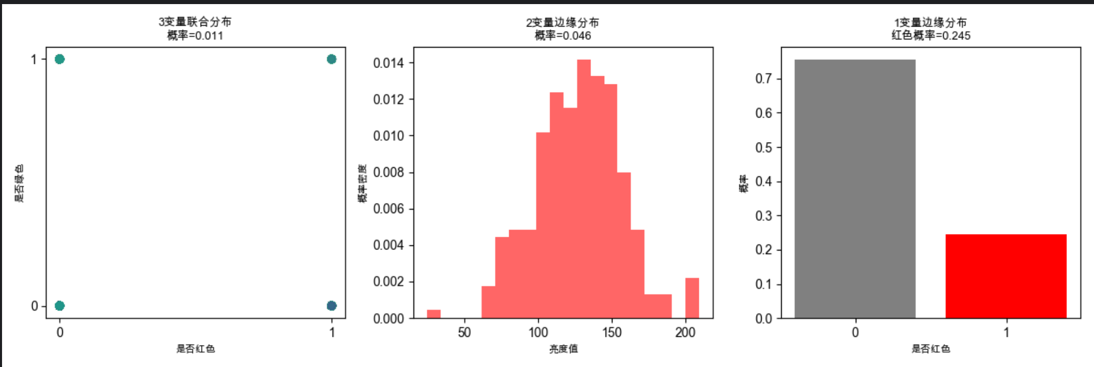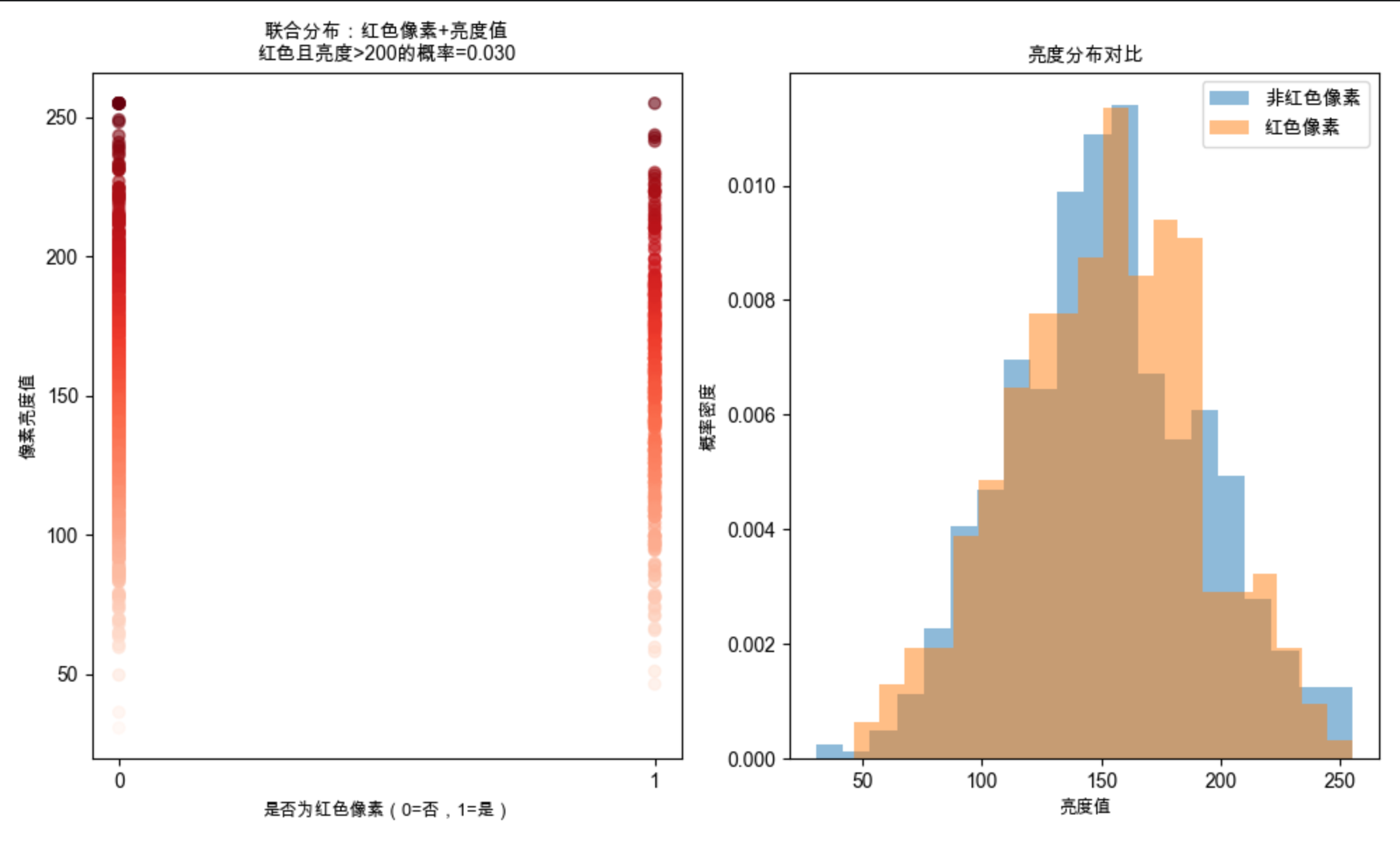 plt.title(f'联合分布:红色像素+亮度值\n红色且亮度>200的概率={joint_prob:.3f}', fontsize=10)