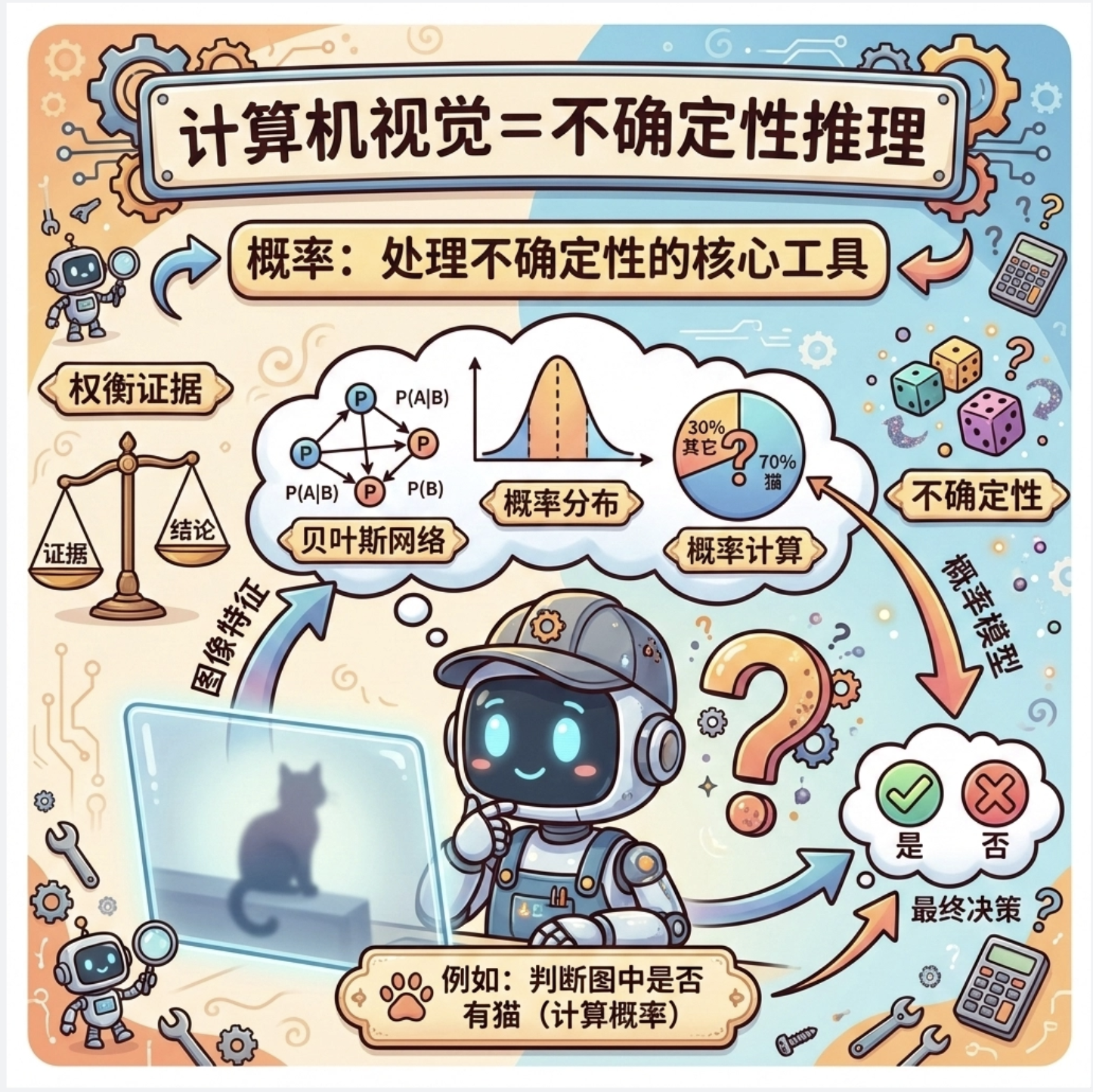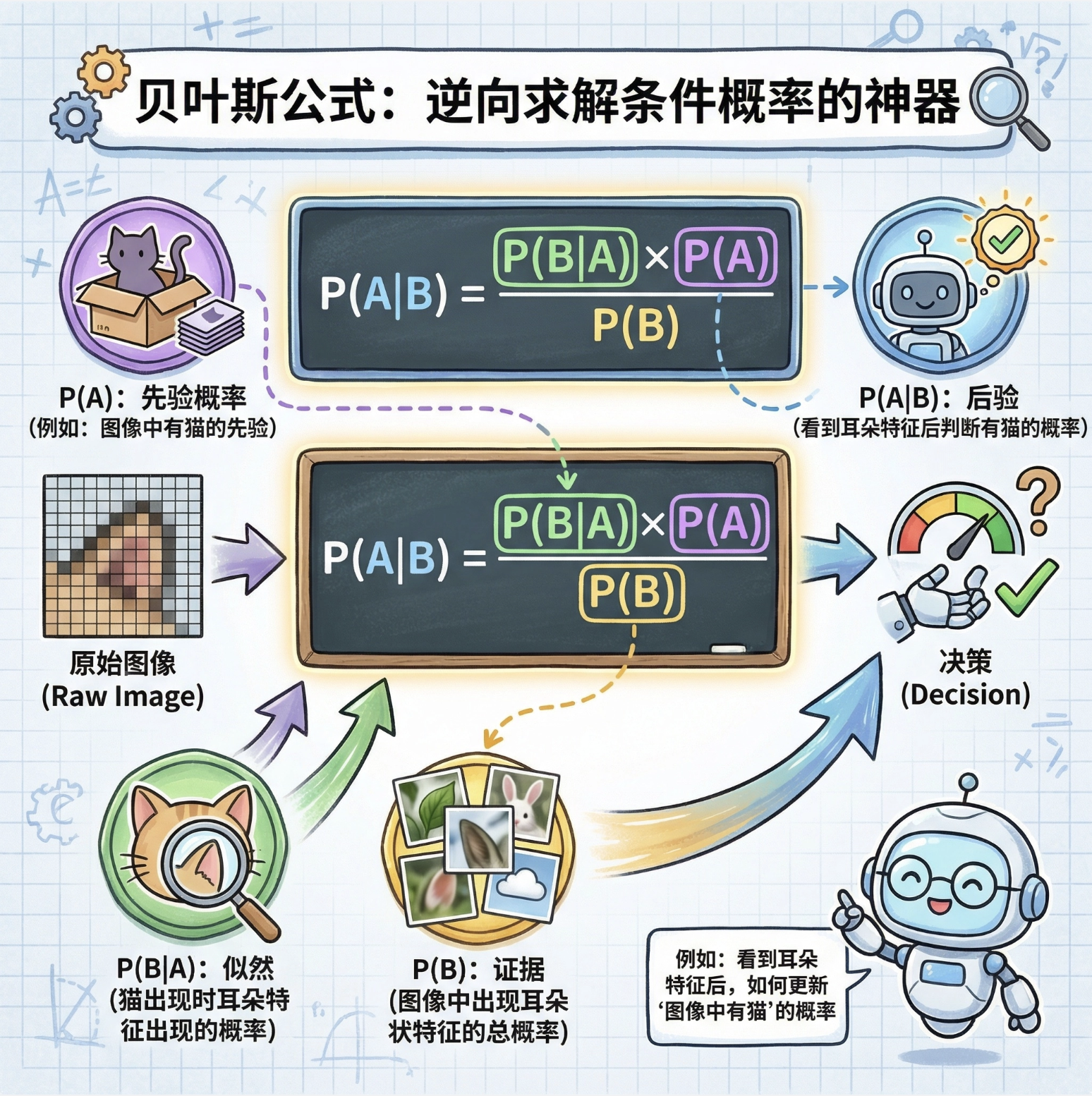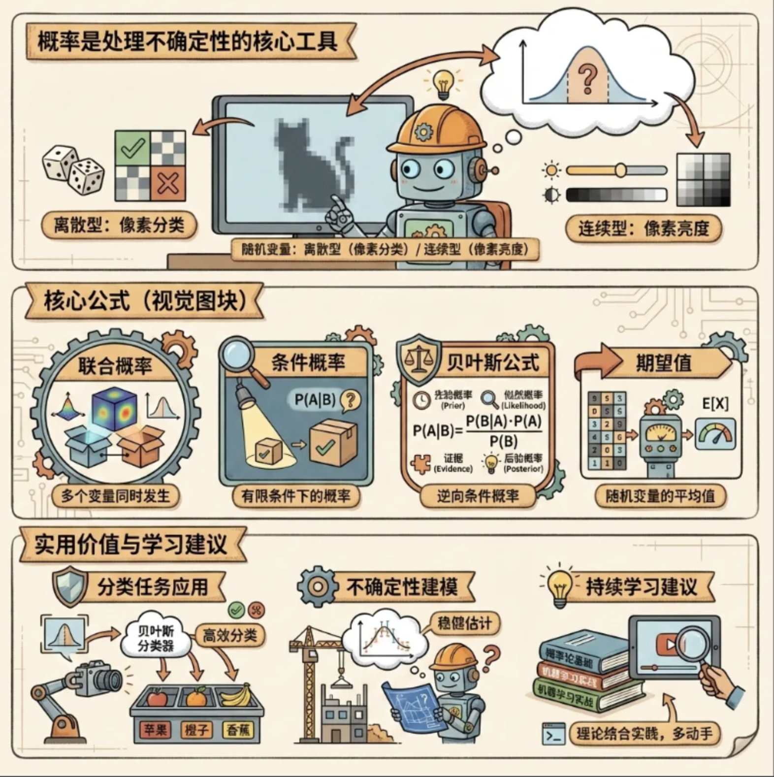 2.核心公式:联合概率(多变量同时发生)、条件概率(限定范围)、贝叶斯公式(反向条件概率)、期望(平均取值);