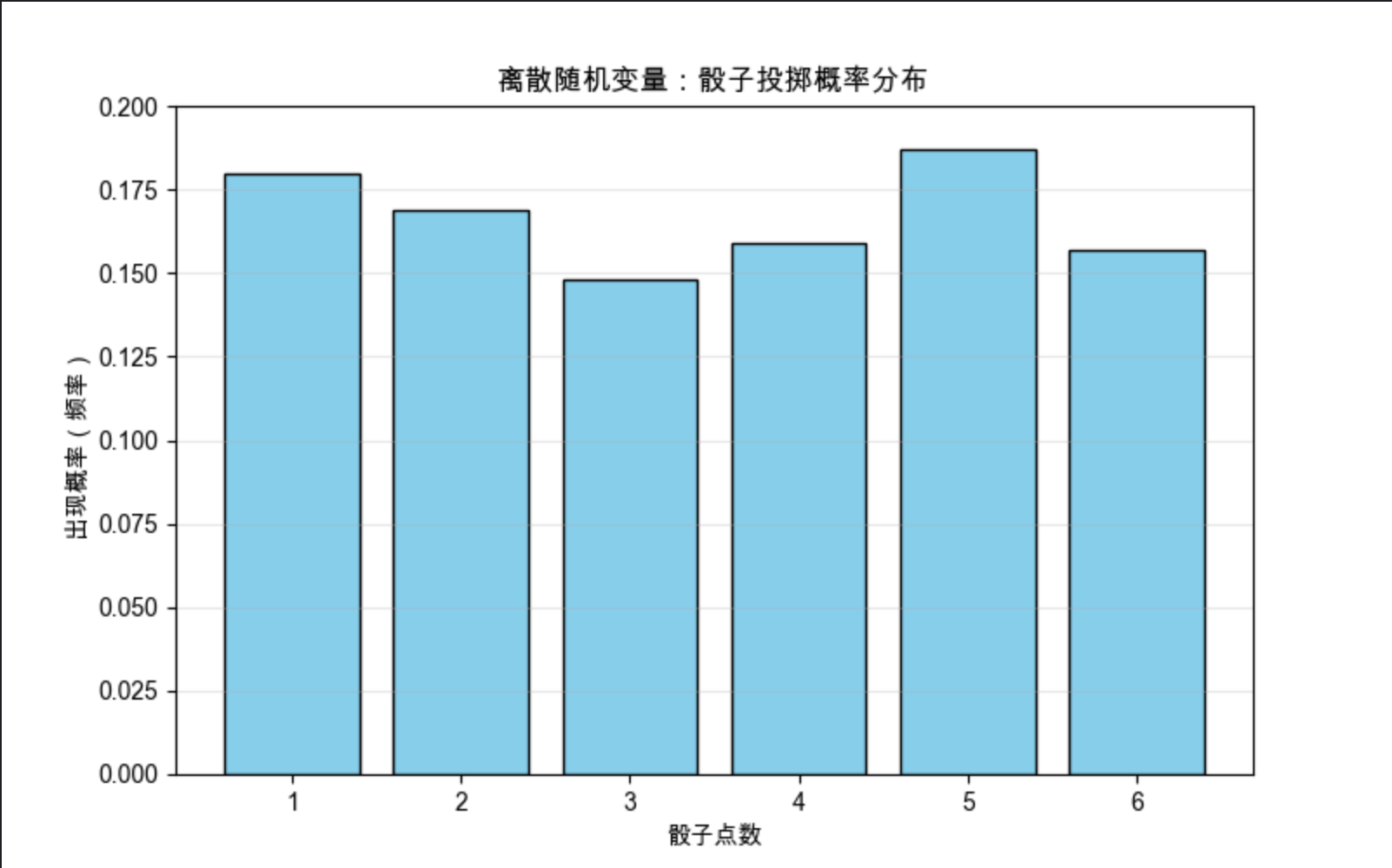 - 离散随机变量图:骰子每个点数的出现概率接近 1/6,符合均匀分布特性;