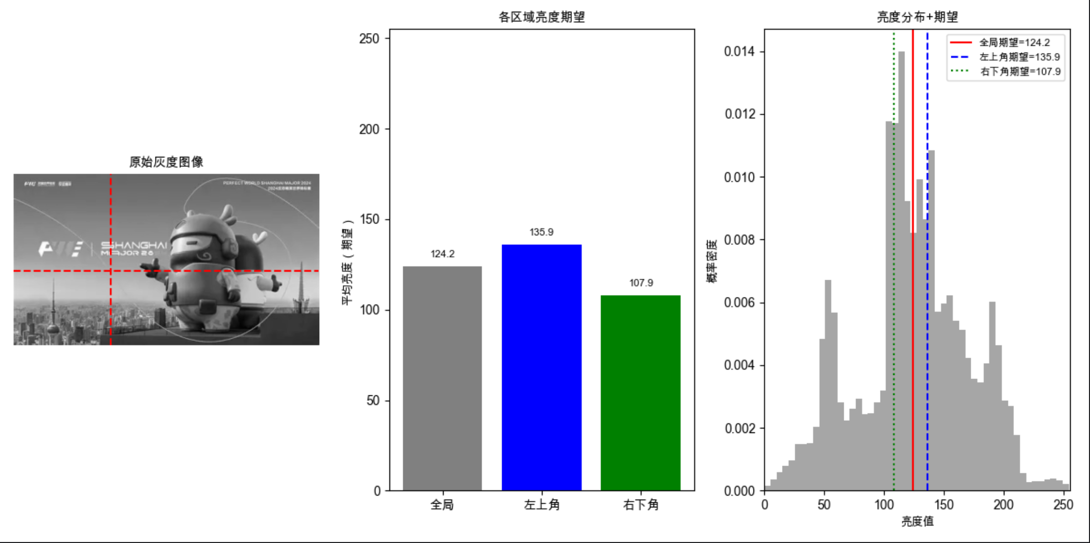 # 子图3:全局亮度分布直方图 + 各区域期望线(直观体现"期望是分布的中心")