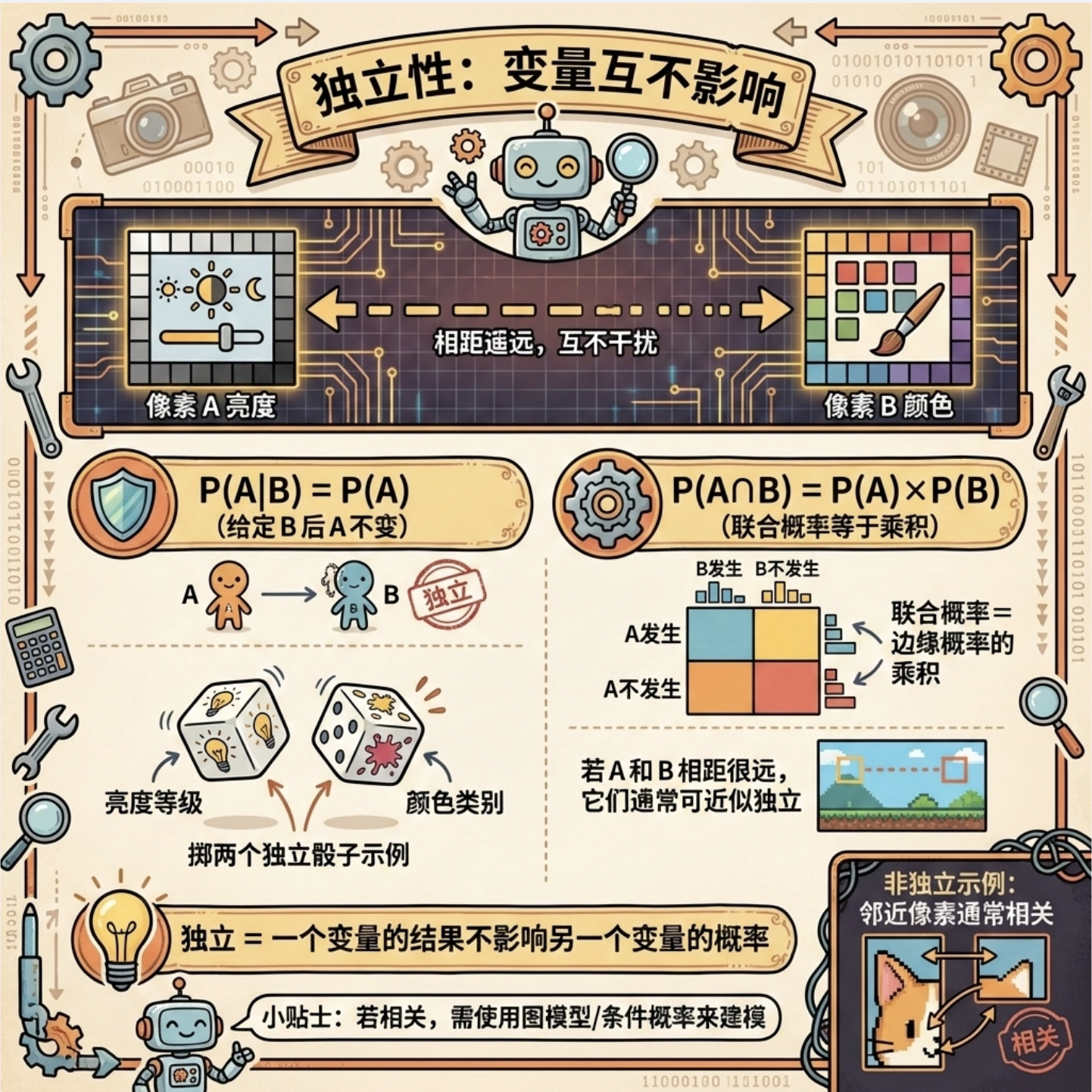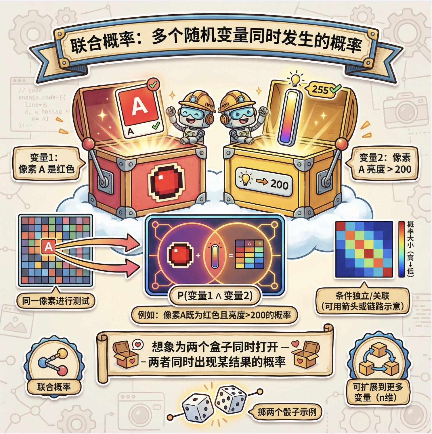 类比:图像中 "像素 A 是红色(变量 1)" 且 "像素 A 的亮度 > 200(变量 2)" 的概率