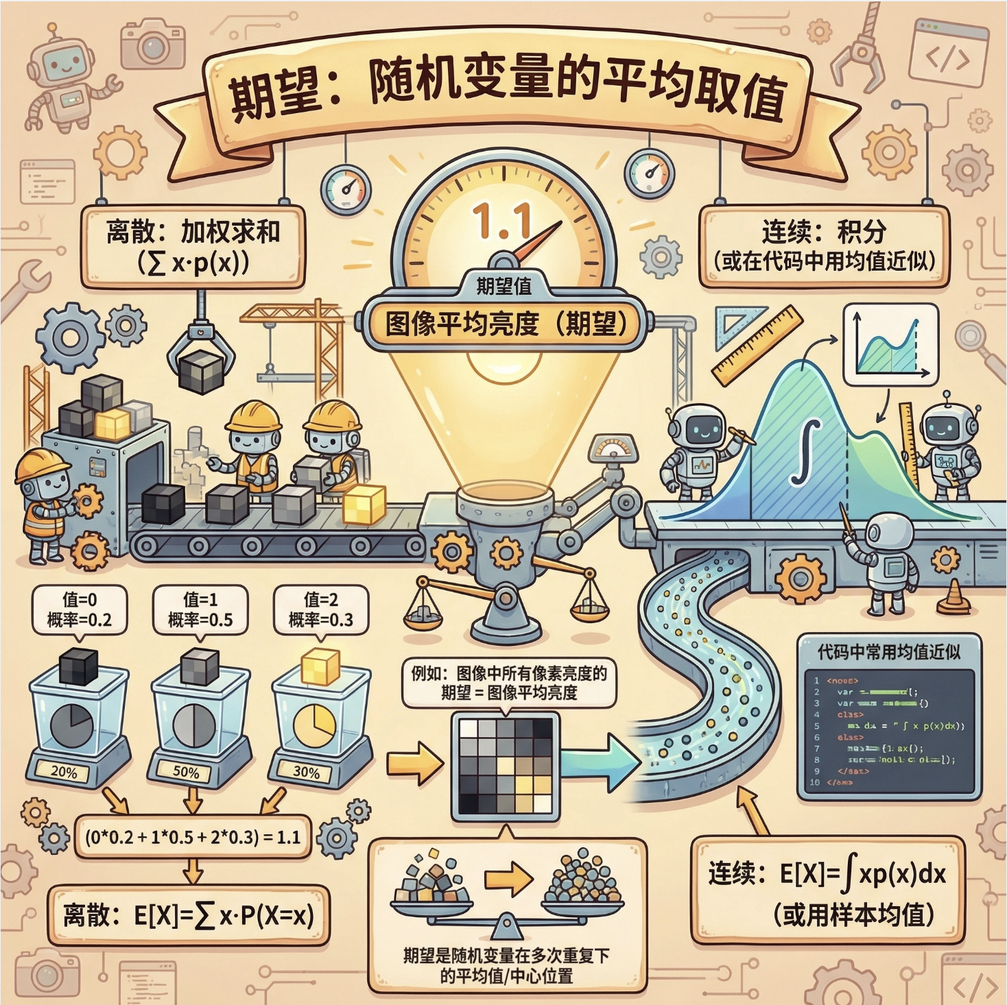 1.概率是计算机视觉处理 "不确定性" 的核心工具,随机变量分为离散(如像素类别)和连续(如像素亮度)两类;