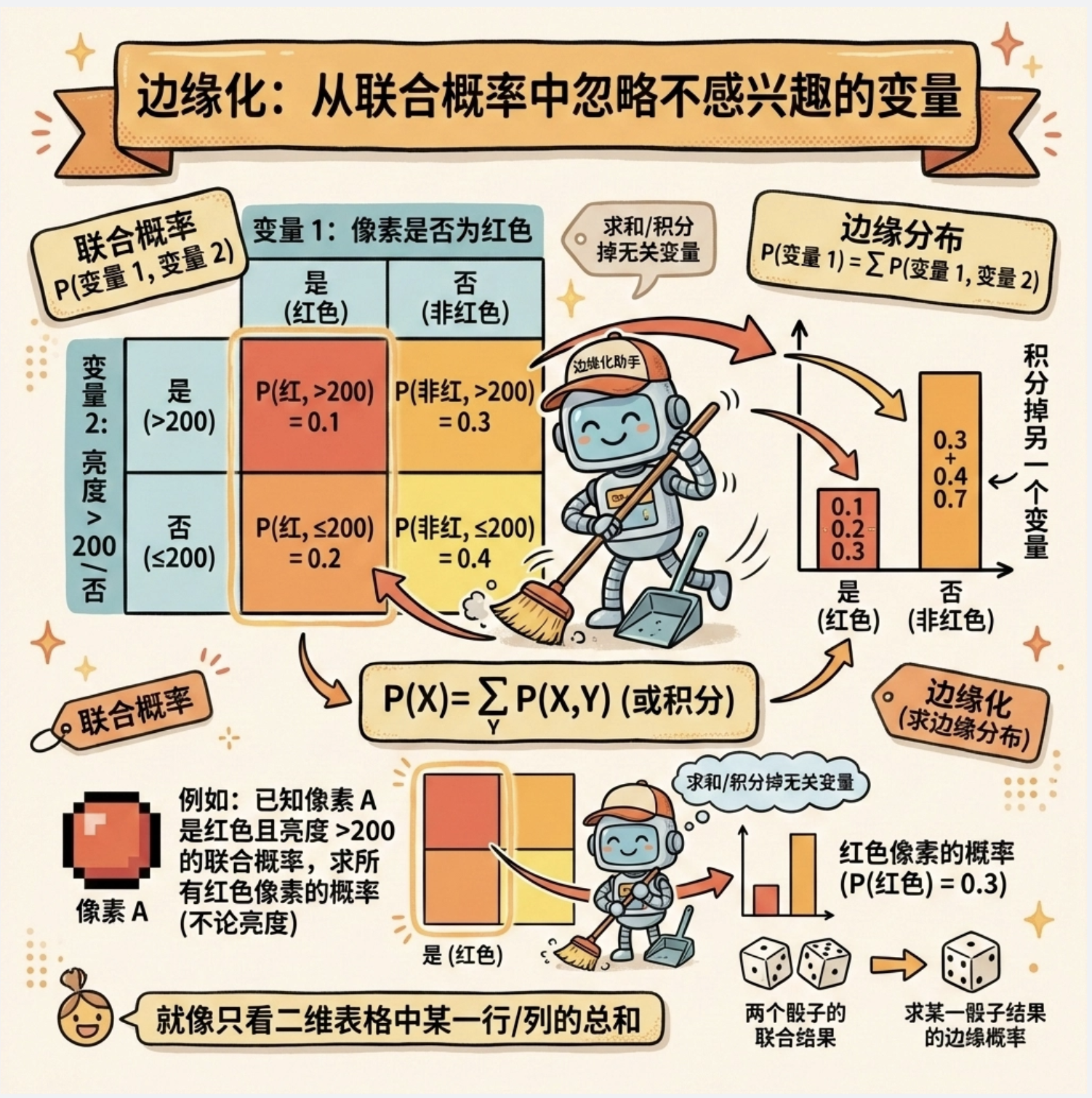 - 离散随机变量:扔骰子(结果只能是 1-6)、图像中某个像素是否为边缘(是 / 否)