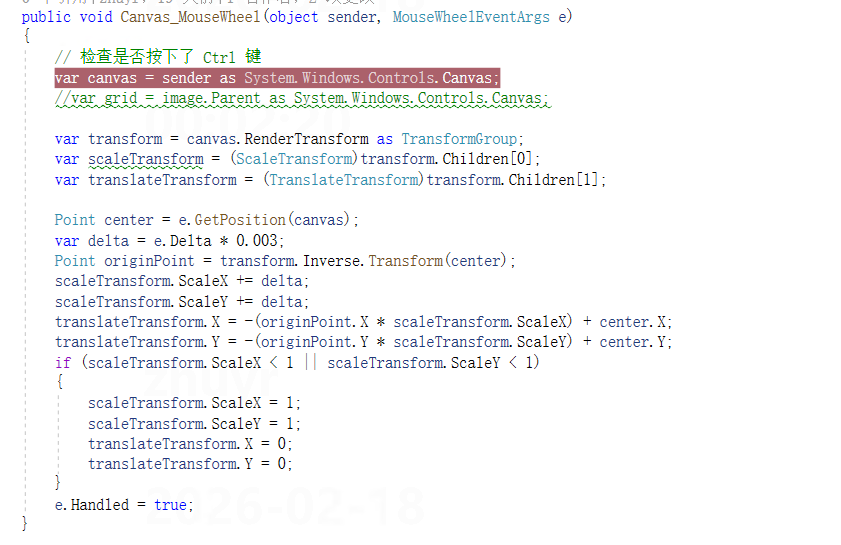 -. canvas_mousewheel(object sender,MouseWheelEventArgs e)这个事件主要功能是为了实现通过鼠标进行canvas控件的缩放