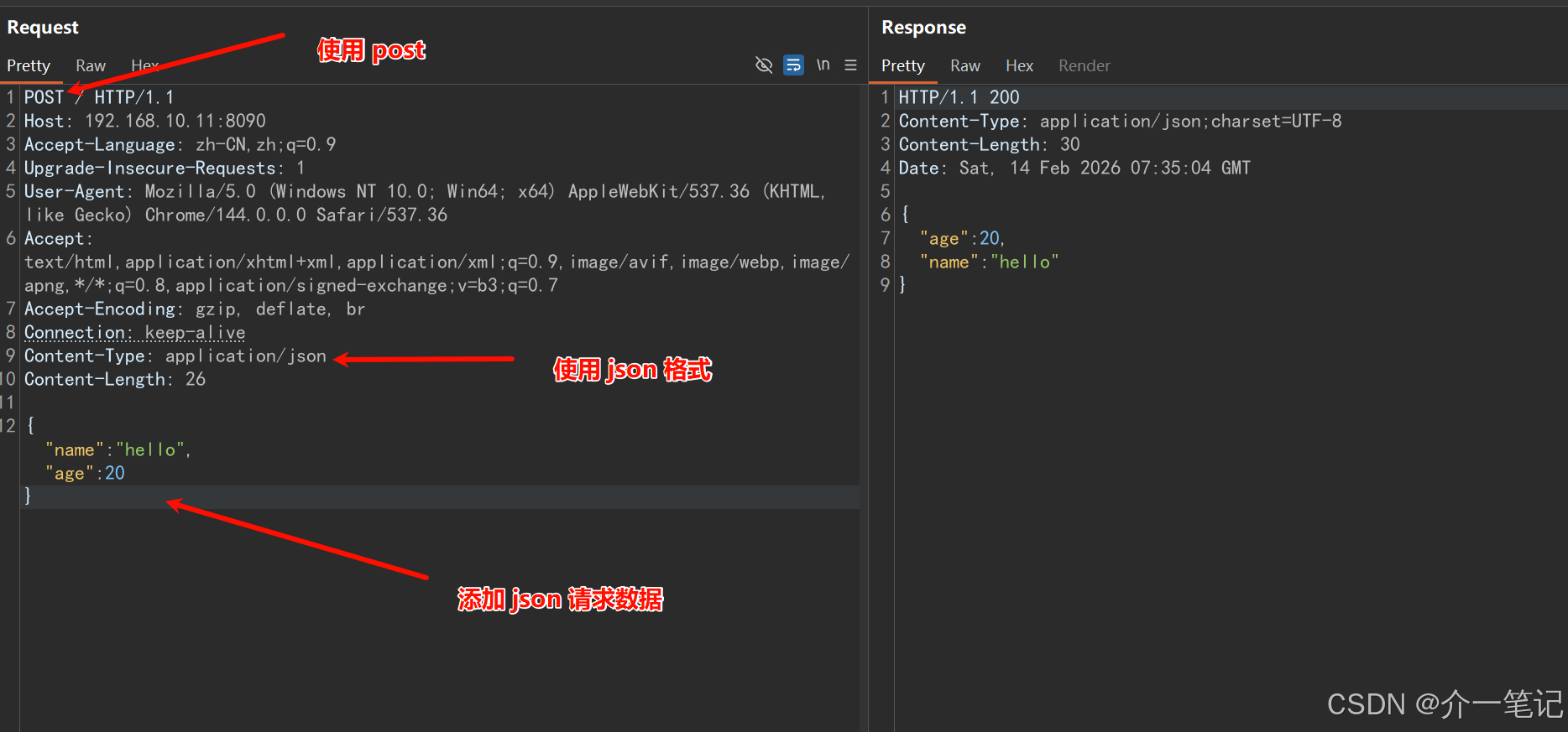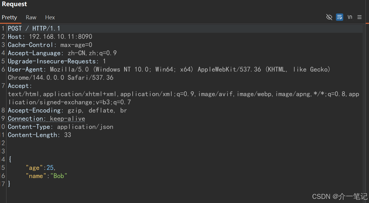 同样修改请求为 POST 并且数据为 JSON 格式,