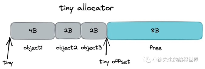 每个 P 独有的 mache 会有个微对象分配器,基于 offset 线性移动的方式对微对象进行分配,每 16B 成块,对象依据其大小,会向上取整为 2 的整数次幂进行空间补齐,然后进入分配流程.